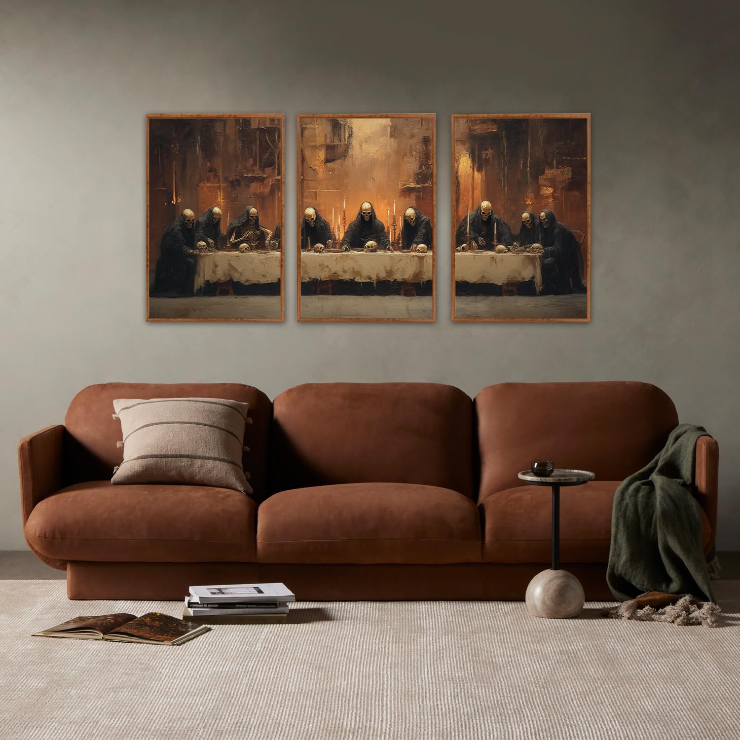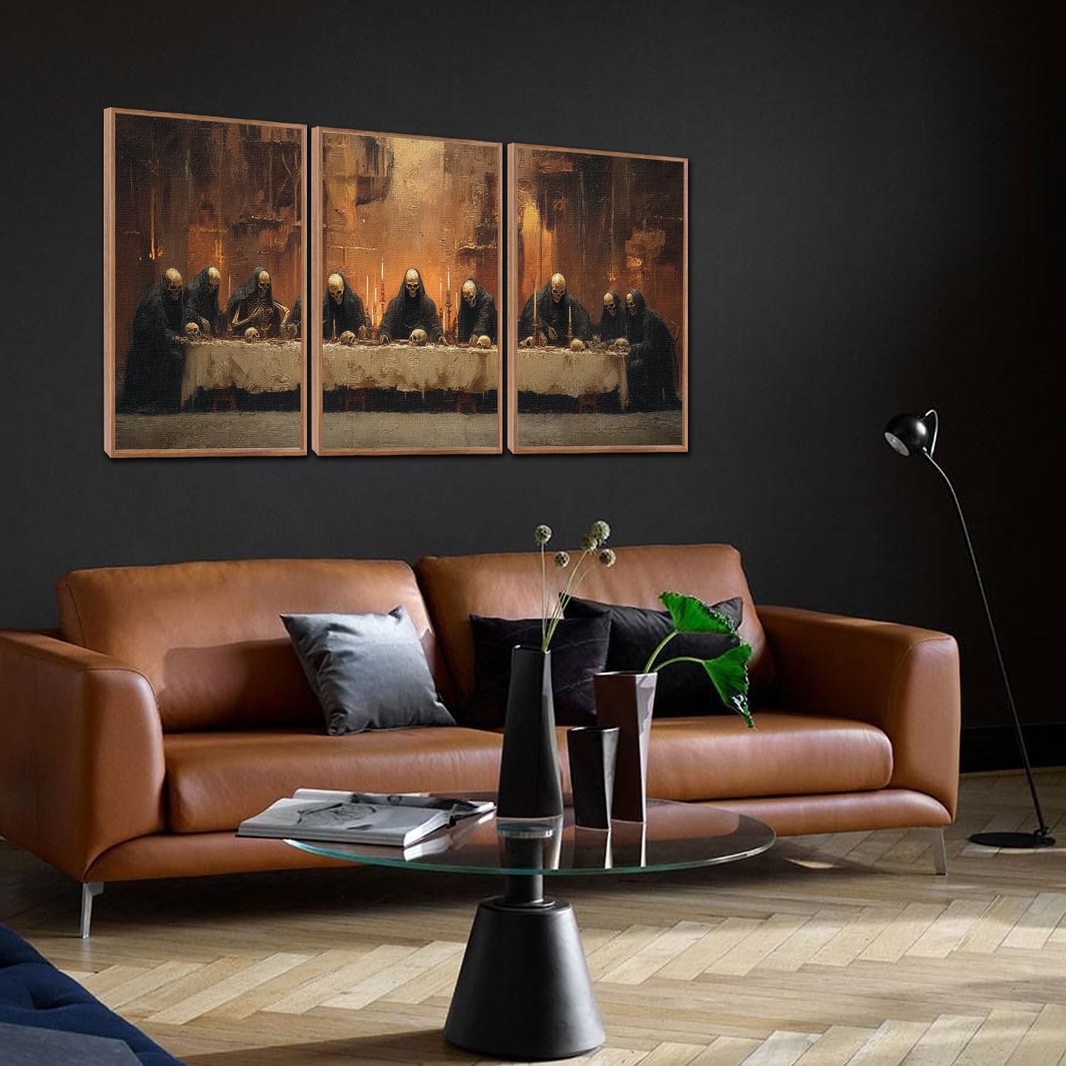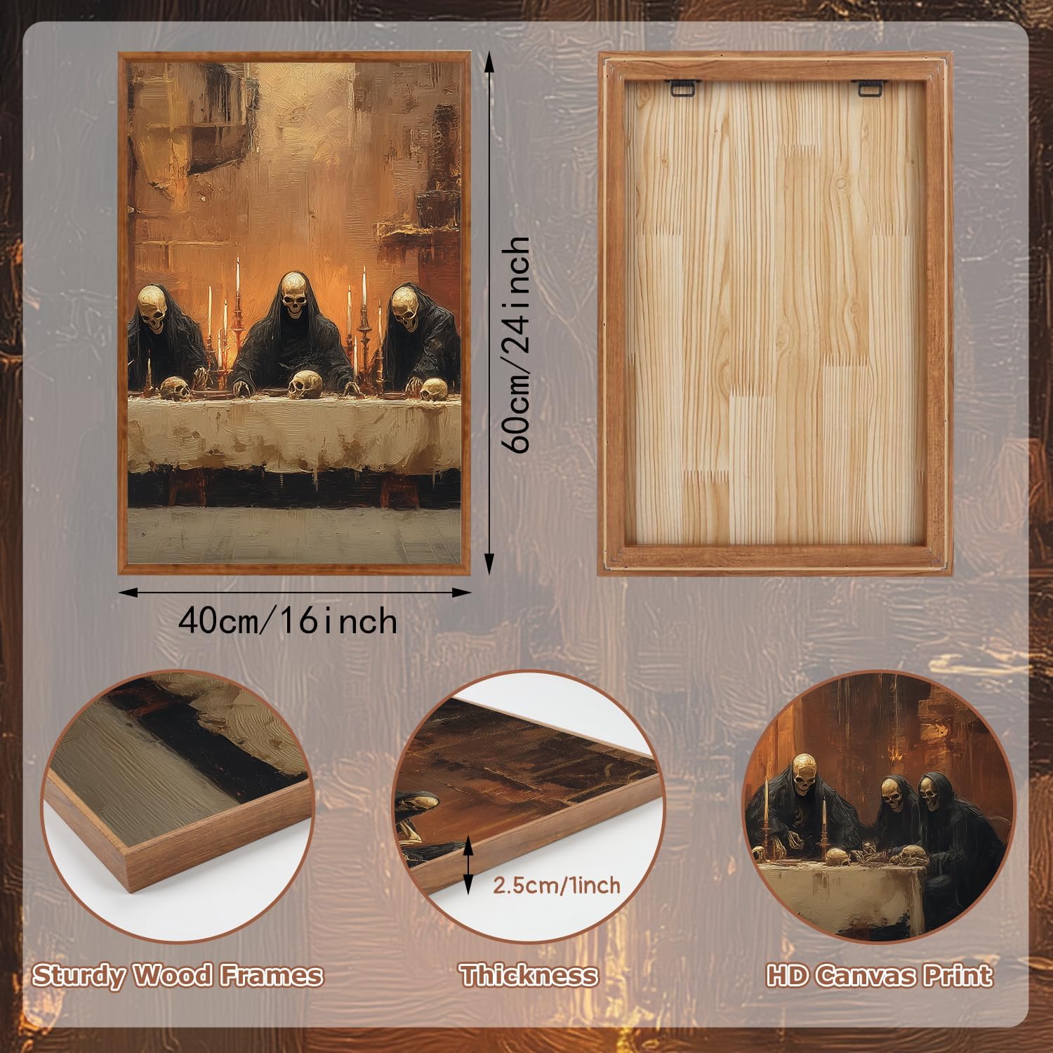 KAIRNE Framed Skeleton Canvas Wall Art,Abstract Retro Skull Pictures Set of 3(16”X24”),Scary Halloween Prints,Horror Wall Art,Skeleton Last Supper Posters for Living Room Bedroom Ding Room Decoration