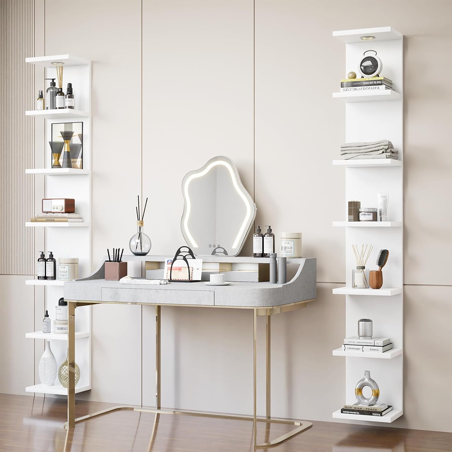 - 【Space-saving & Adjustable LED】- This 7 tier vanity shelves for wall combines functionality and modern aesthetics, vertically with the height of 6.4Ft. It perfectly adapts to long narrow spaces, creatively saves space and flexibly adapts to different items needs. The adjustable LED light strips provide a variety of colors and brightness options, allowing you to find the items you need easily in the dark, making it easy to illuminate displayed items (such as books, decor) and highlight the display effect