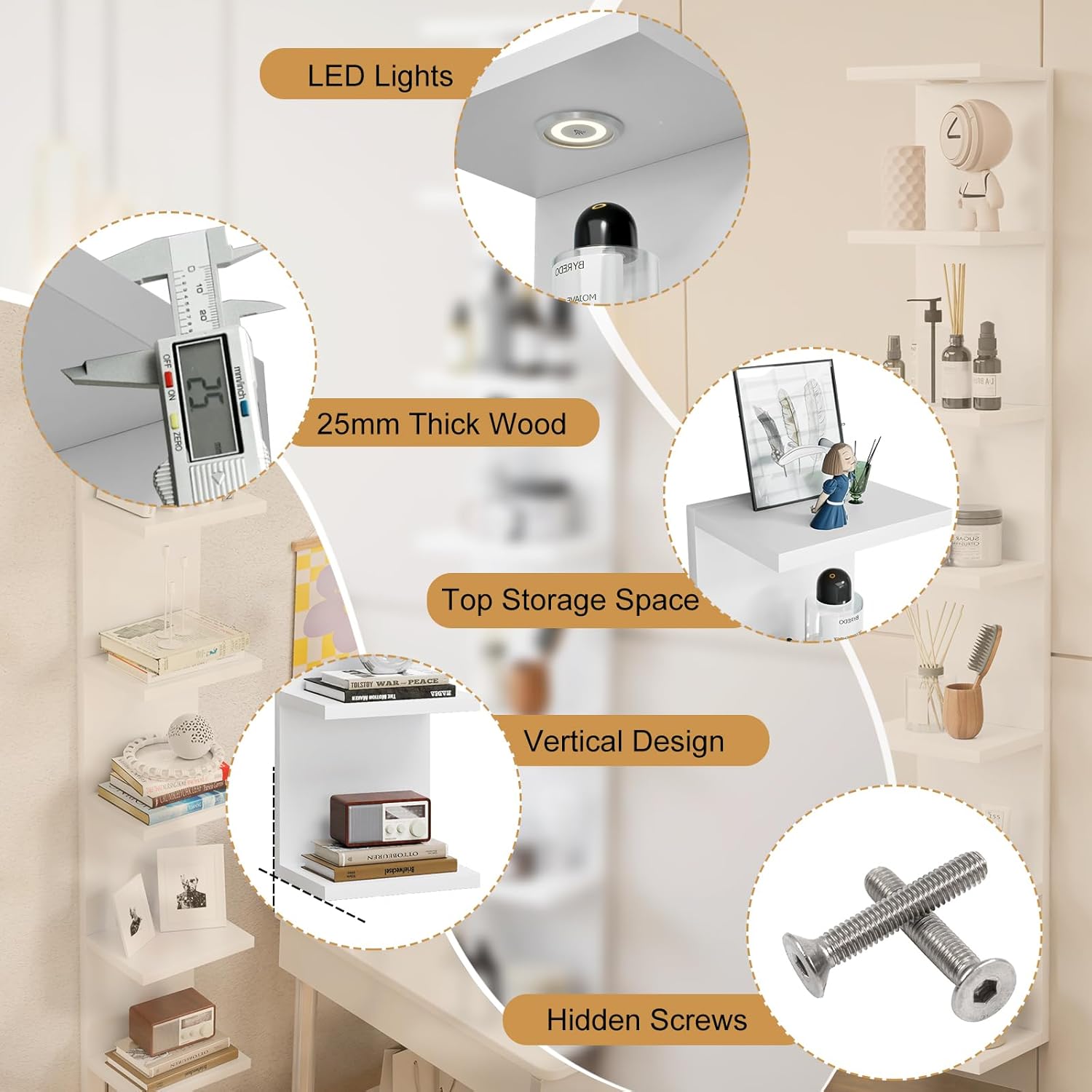- 【Wide Applications】- It can be used as a cabinet bottom lamp in the kitchen, as a desktop light in the office, as a TV cabinet background decor in the living room, as a cosmetics storage with fill light in the bedroom, and provide light assisted night pickup in the entrance to avoid turning on the headlights to disturb others. This white wall shelf unit can create a beautiful & refined atmosphere for your home or work environment, and its an ideal storage and decor complement, can be widely used in home or business space