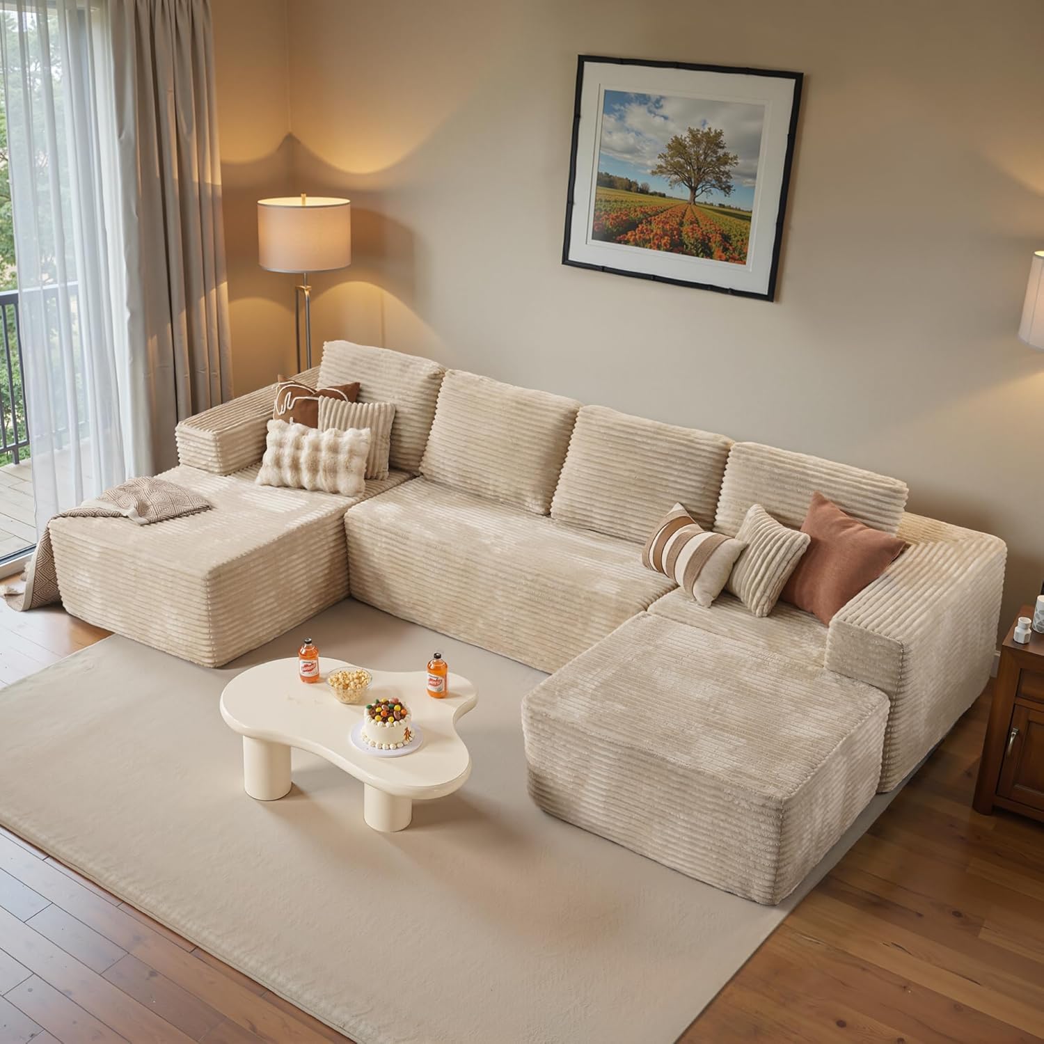 ovios Sectional Cloud Couch for Living Room, Modular Floor Sofa with Plush Corduroy, No Assembly Required, Big Comfy Couches Set with Fluffy Memory Foam, Stupendous U Shaped Sofas with Chaise, Grey