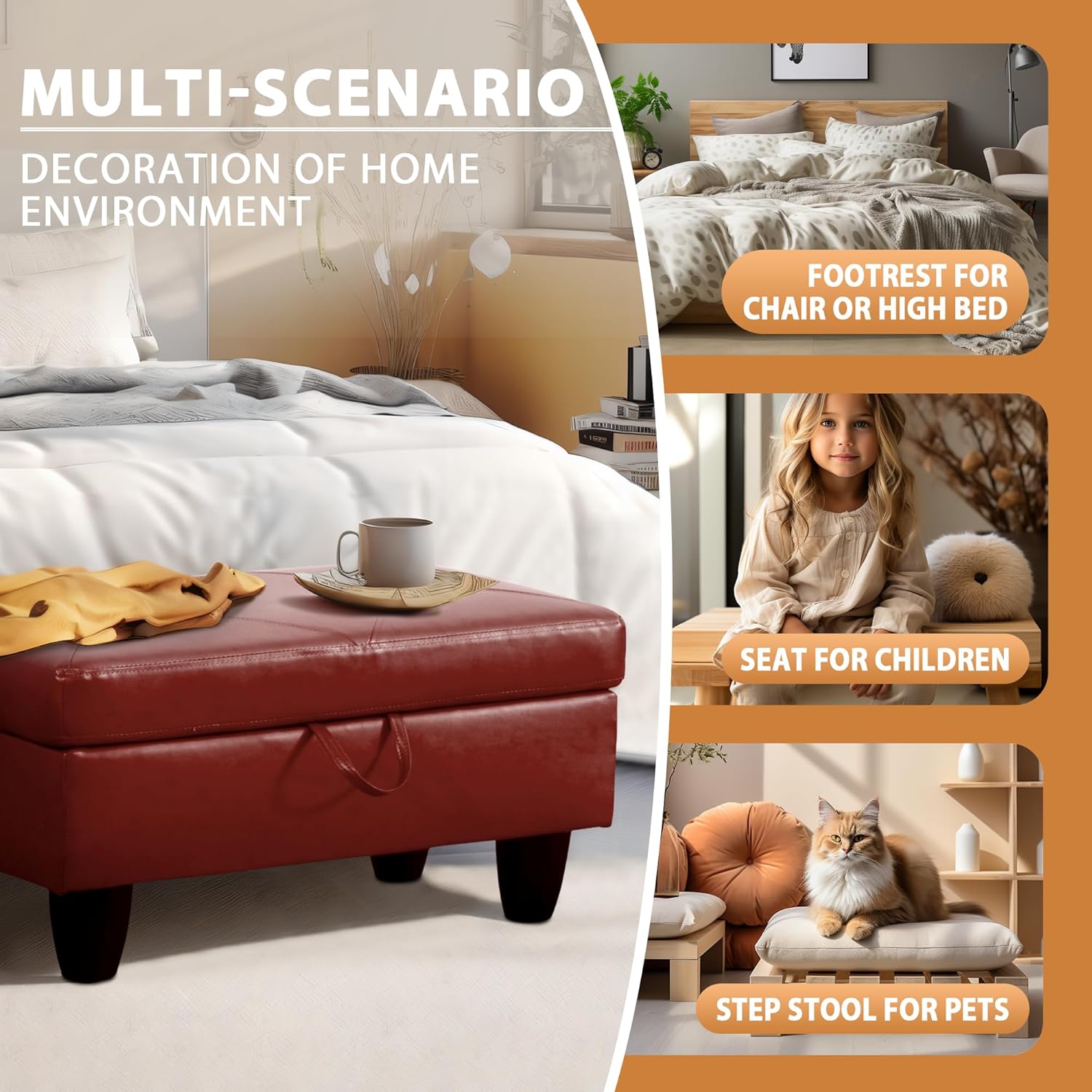 - PREMIUM MATERIALS: This storage ottoman features a thick foam cushion for added comfort. Built with a sturdy solid wood frame and durable plastic feet, it offers long-lasting quality while protecting your floors from scratches. The easy-to-clean faux leather surface gives it a sleek, modern look, and the smooth faux leather lid adds an extra layer of comfort for sitting. Perfect for any room, this ottoman combines style, durability, and functionality.