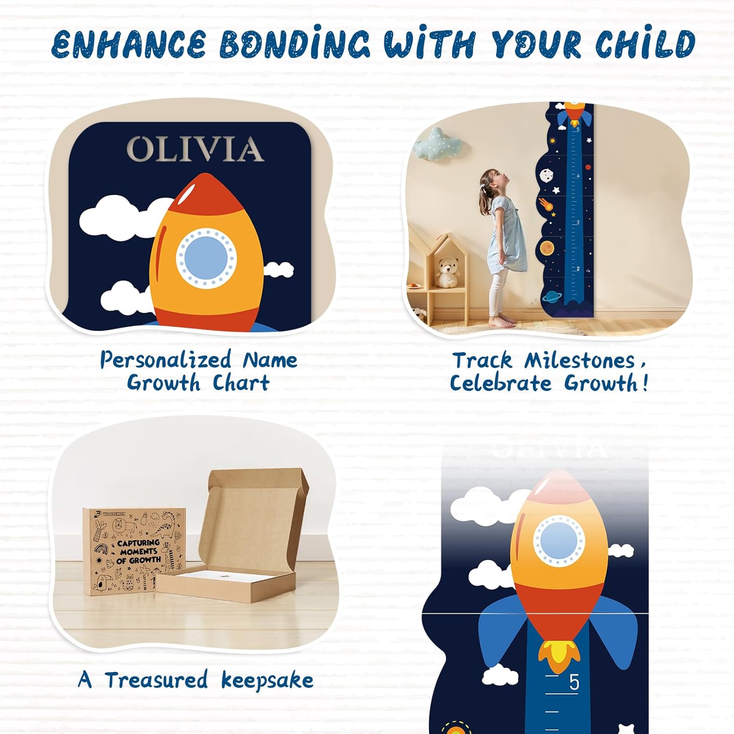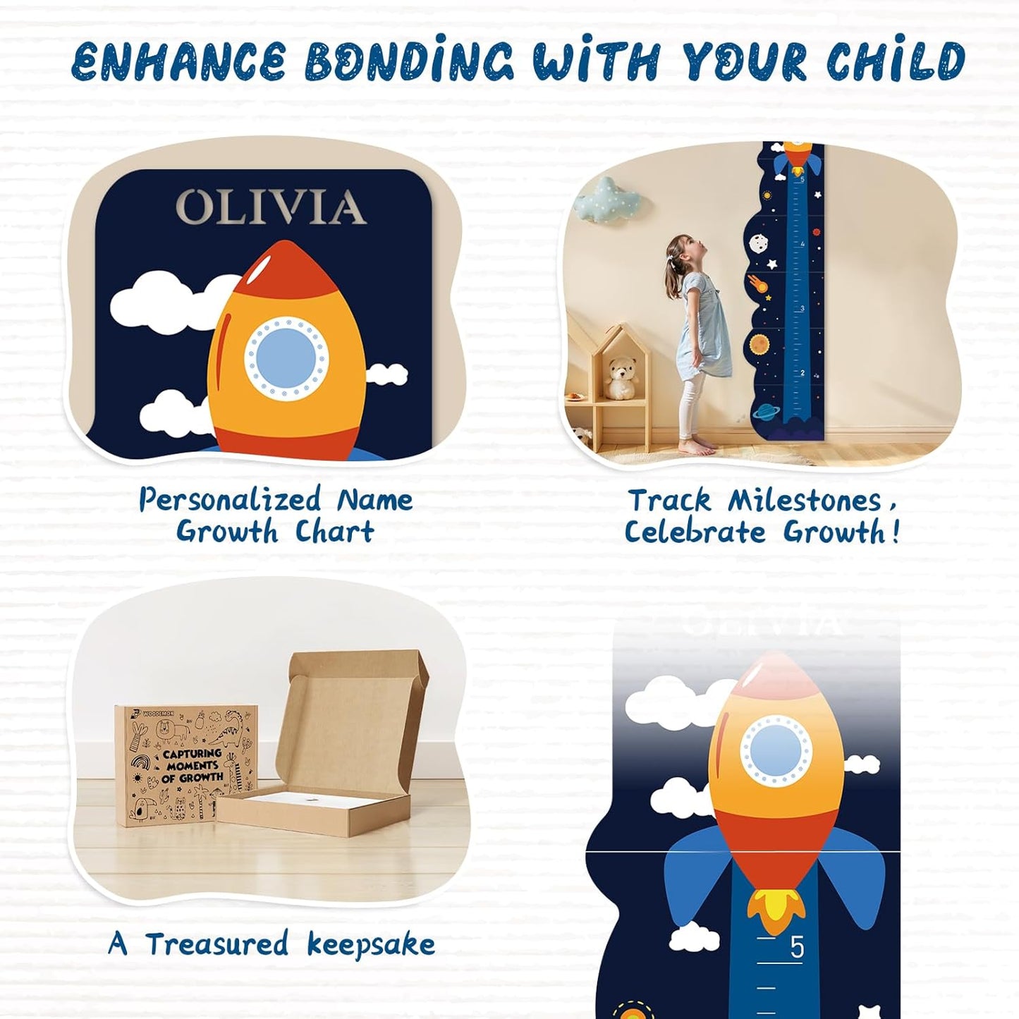 Personalized Name Growth Chart for Wall, Rocket Wood Height Chart for Kids, Height Measurement for Wall, Boy Girls Height Wall Chart Growth Measuring Ruler, Toddler Playroom Decor