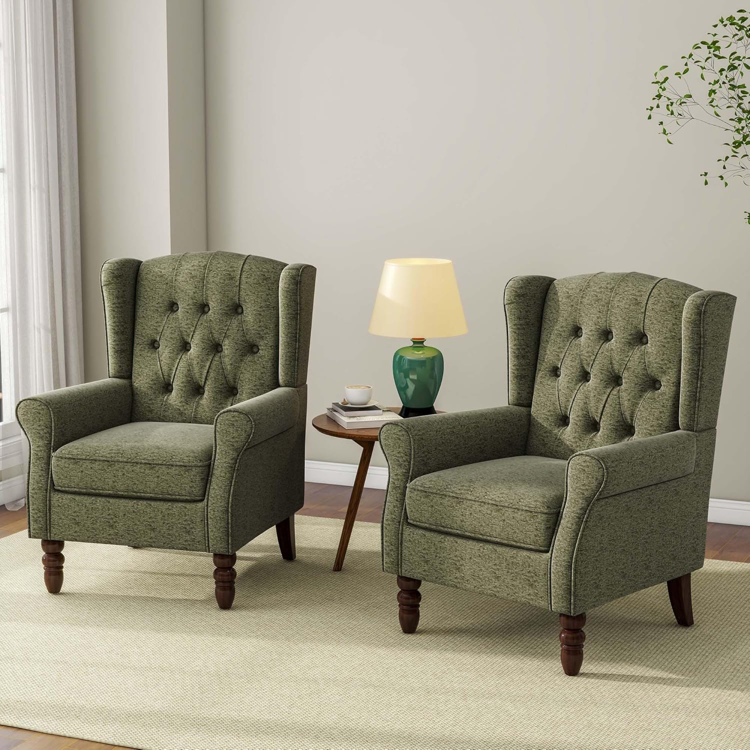 Accent Chair, Upholstered Armchair with Button Tufted High Back & Solid Wood Legs, Comfy Wingback Reading Single Sofa Chair for Small Spaces, Living Room, Bedroom (Green, Set of 1)