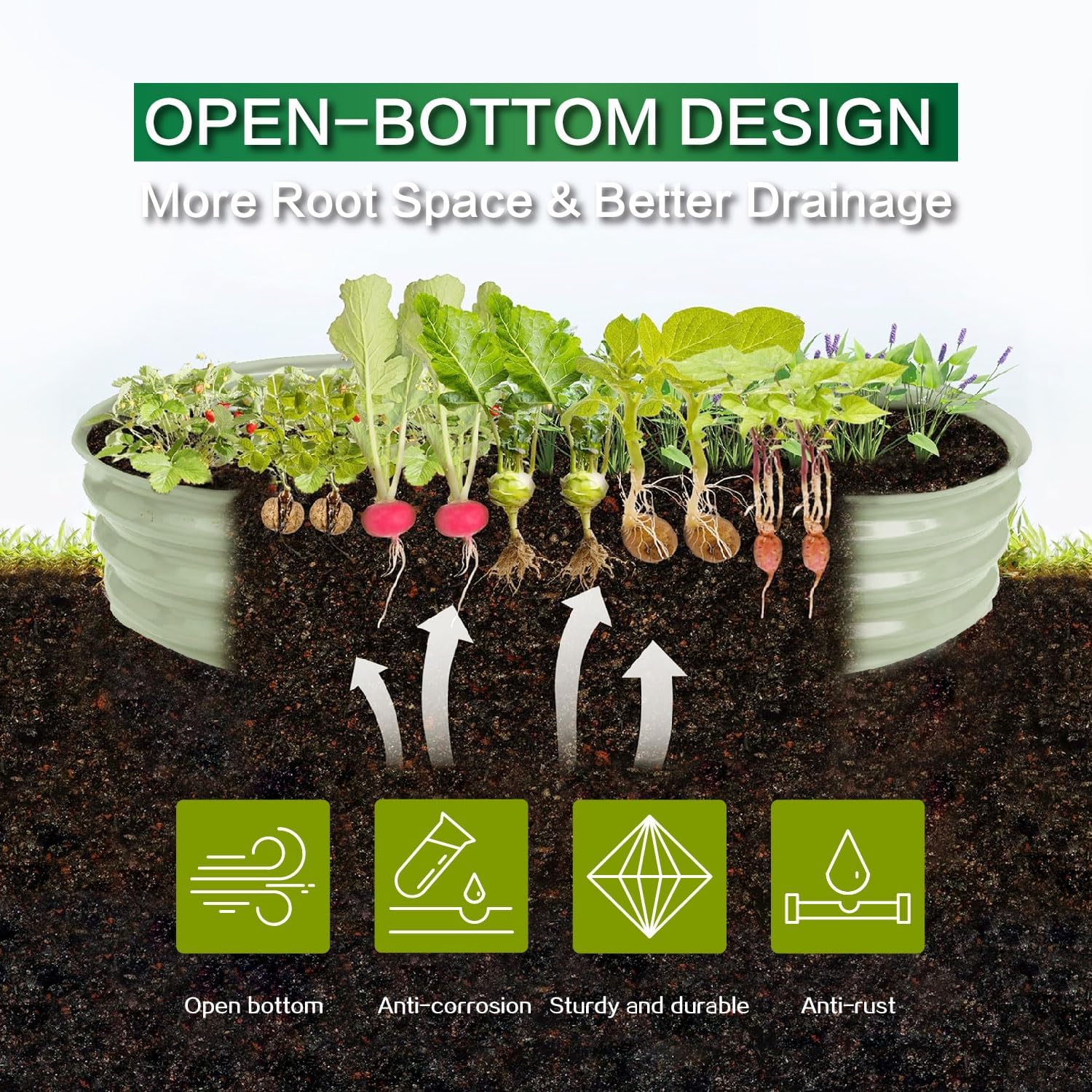 - OPEN BOTTOM DESIGN: Gardmax galvanized planter raised beds are designed with an open bottom, which is good for drainage to protect plants, plant roots won't be sick from excessive water. It also keep weeds away from soil and keep out small pets like chicken, puppies, rabbits to protect your plants
