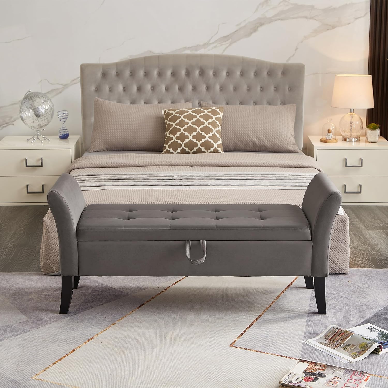 Furniliving 51” Bedroom Bench, End of Bed Bench with Button-Tufted Large Upholstered Storage Bench Ottoman Velvet Window Bench with Storage Shoe Cabinet Bench, for Bedroom, Entryway, Closet, Grey