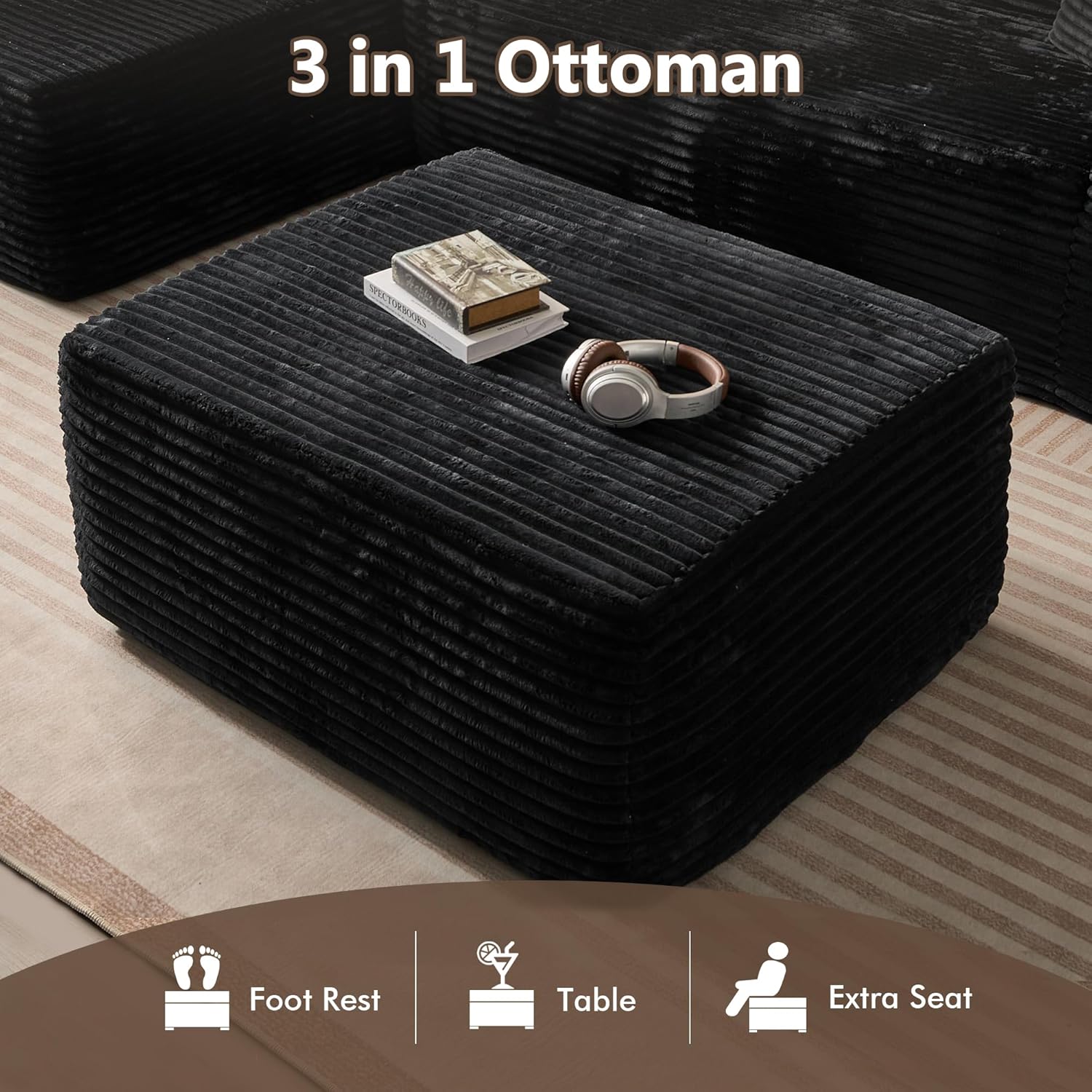 HOOOWOOO Cloud Sectional Couch for Living Room,Modular Sectional Sofa No Assembly,Matching Plush Corduroy Ottoman(Black)