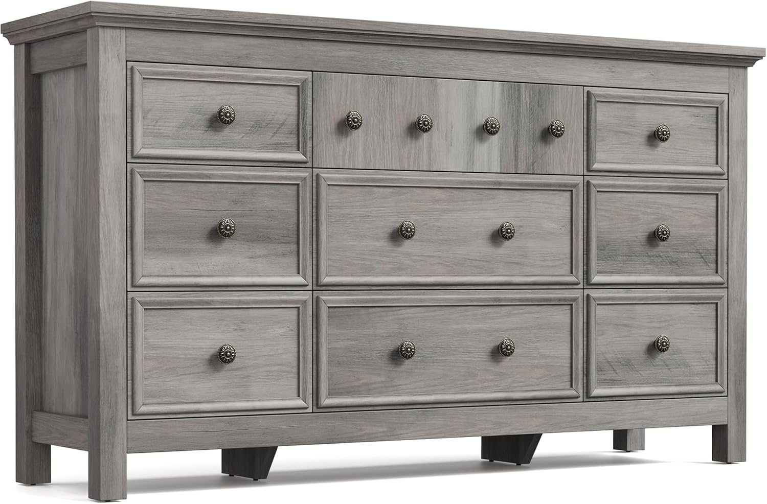 - 【Versatile, Stylish Dresser】 This drawer dresser offers an array of possibilities for your home organization. Its spacious tabletop serves as a stylish canvas to beautifully showcase framed photos, artistic accents, and more. It features 9 smooth-glide drawers, offering efficient storage solutions. Keep your space neat and tidy by conveniently stowing clothing, bedding, cosmetics, jewelry, and more. Perfect for bedroom, living room, hallway, entryway.