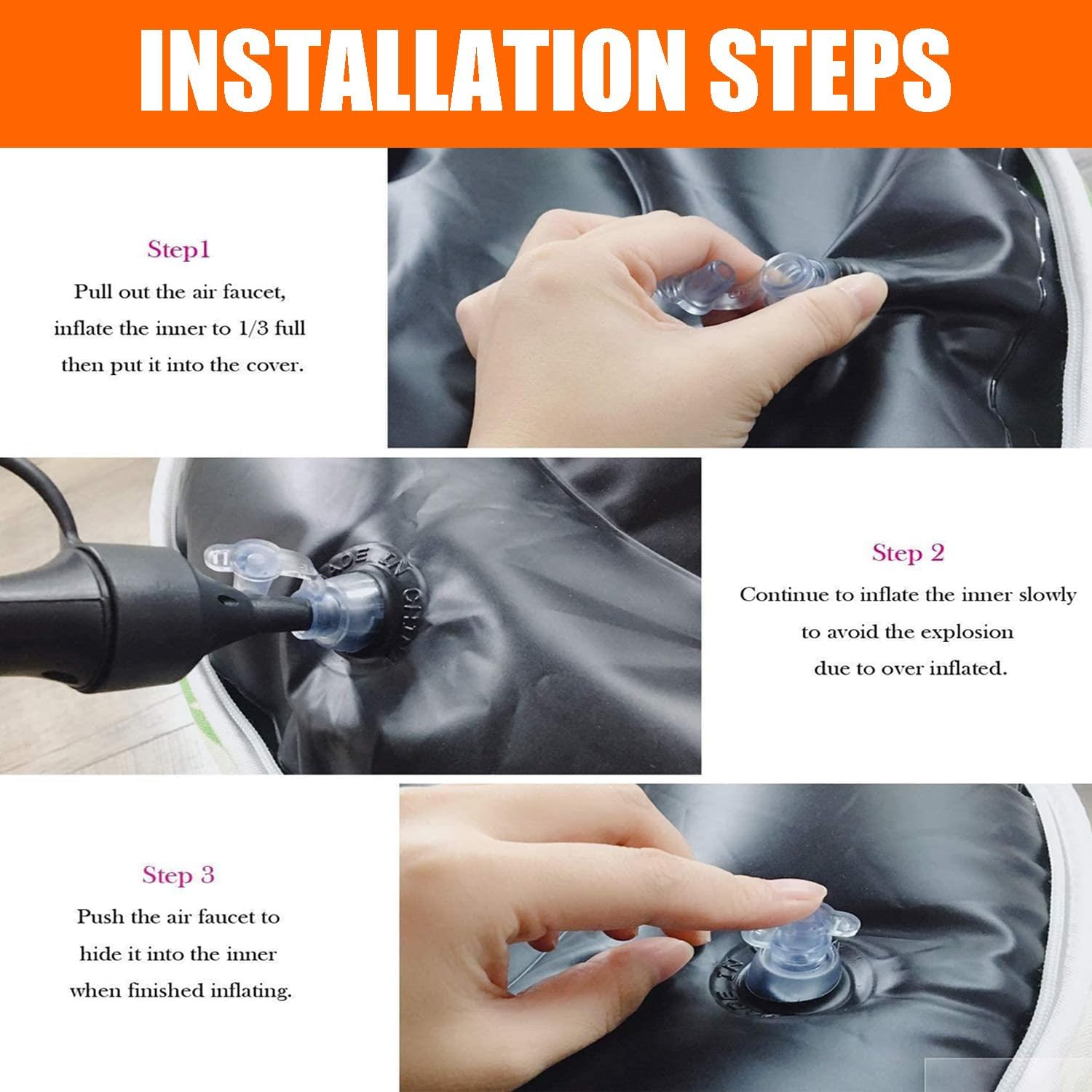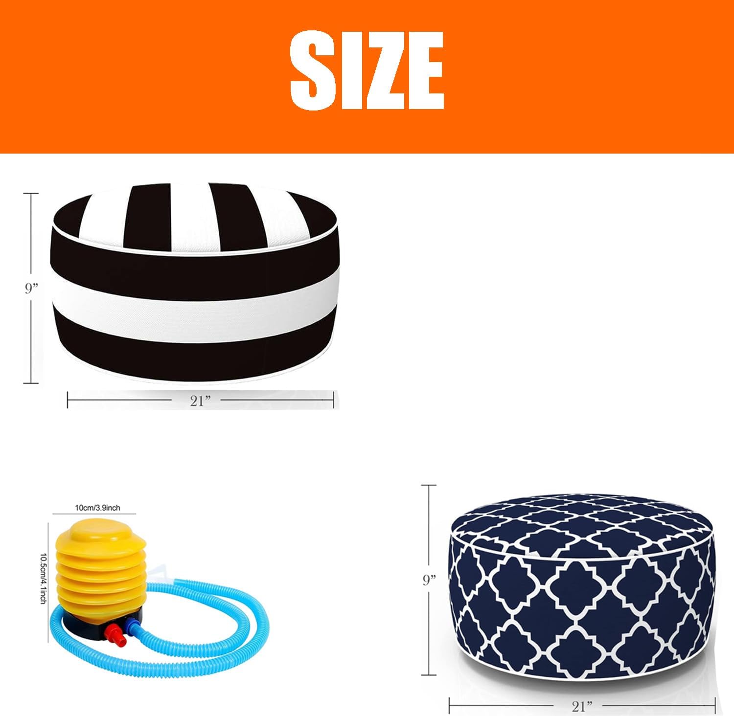 - Package Including: This Value Bundle Come With 1 Pcs Indoor Outdoor Inflatable Ottoman, 2 Pcs Different Styles Sturdy Pvc Liners And 1 Pcs Foot Pump. Measures D21” X H9” (53 X 23cm).