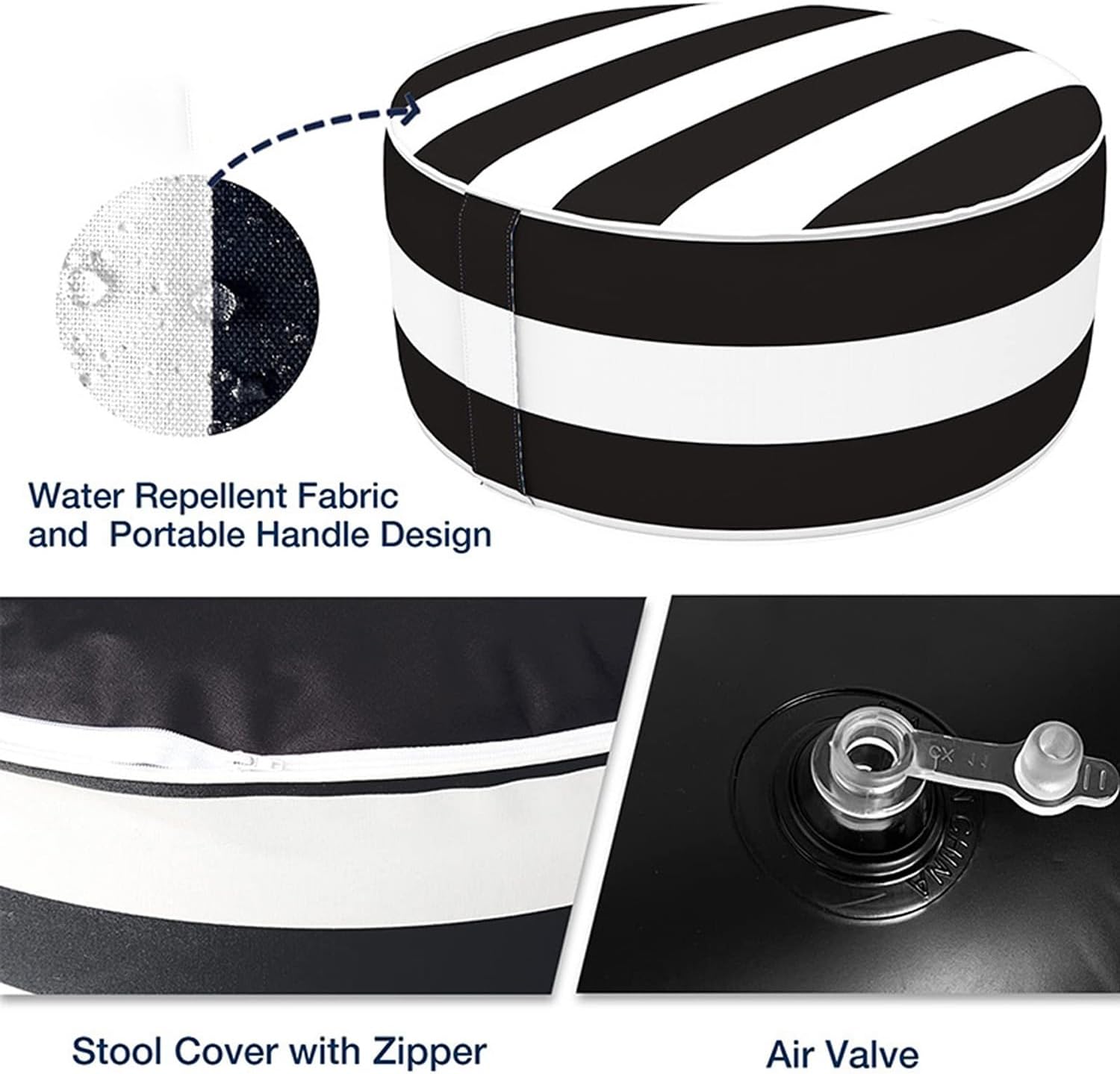 - Durable Outdoor Material: Inflatable Ottoman Cover Made From Durable, Waterproof Material That Can Withstand Exposure To All Weather. Fade-Resistant Keep Its Original Color And Pattern Even If Exposed To The Direct Sunlight For Over 500 Hours. The Black Inner Made Of Waterproof Thick Pvc Fabric That Can Bear Up 300 Lbs.Very Easy To Clean And Maintain.
