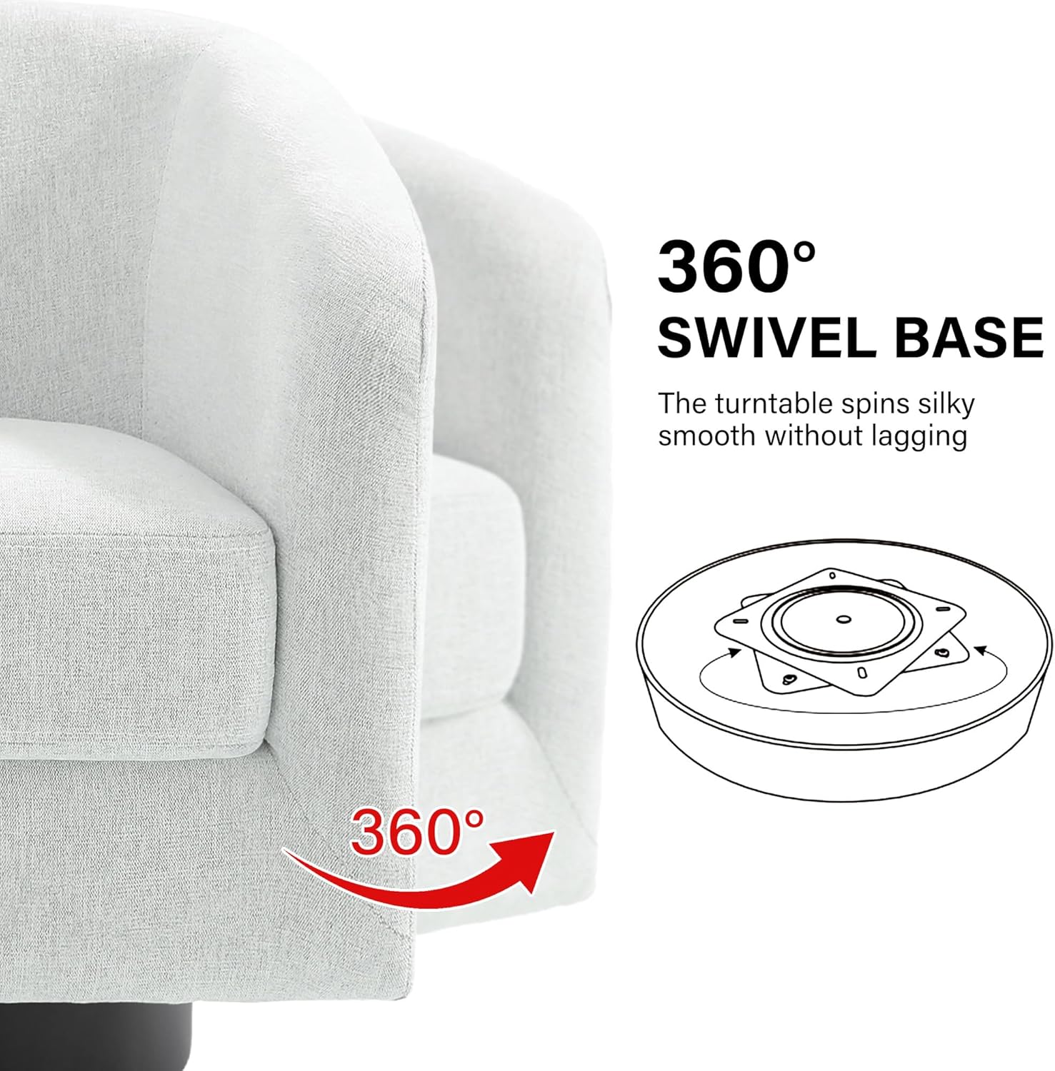 - 360 Degree Swivel Barrel Chair: This 360 degree round swivel chair designed for your leisure comfort. Heavy solid turntable, making it more stable and not wobbly