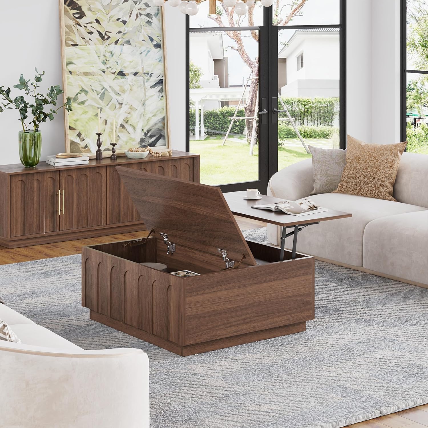 Lift Top Coffee Table with Storage, Mid Century Modern Coffee Table with Arched Design, 31.5" Square Tea Table with Wood Grain, Multifunctional Center Table for Living Room, Office, Walnut