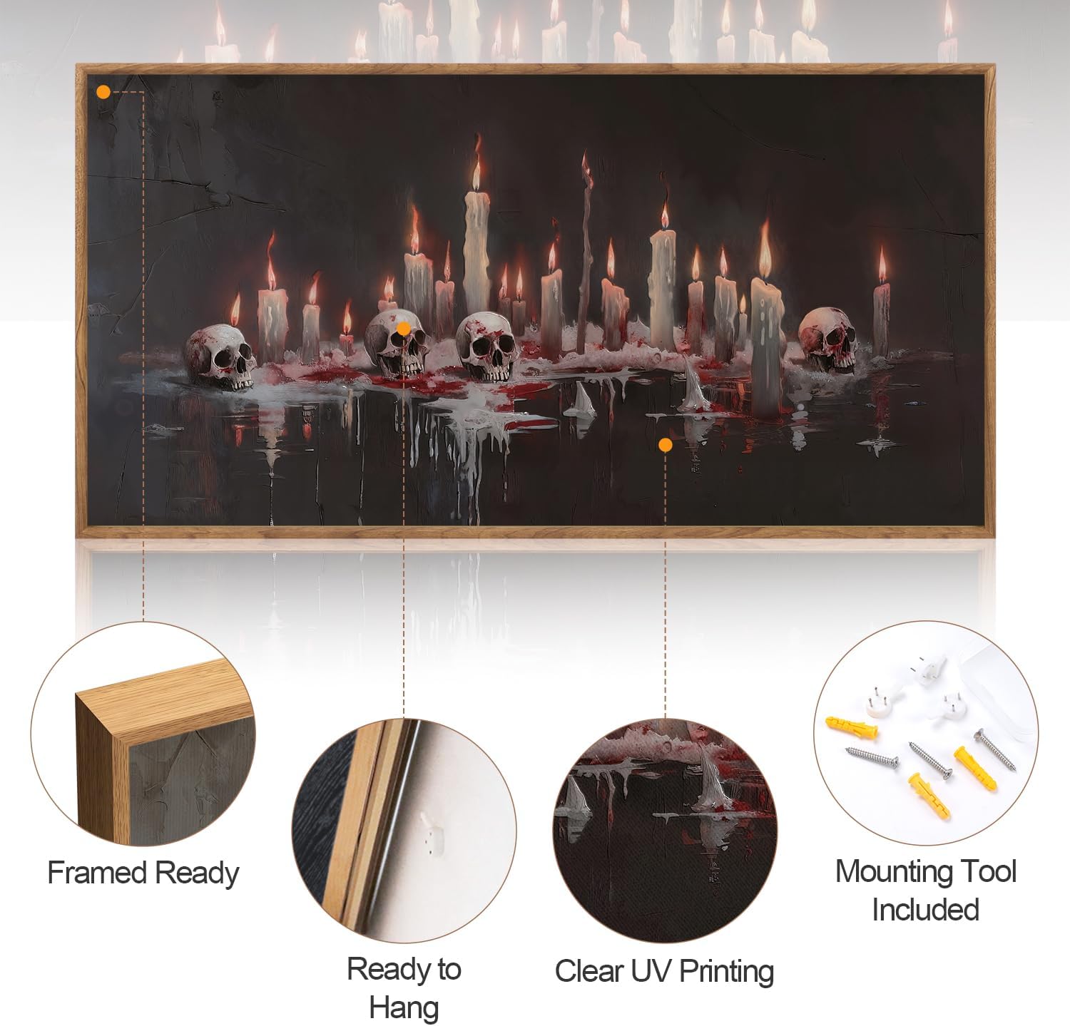 Aurlan Gothic Bloody Skull and Candles Framed Wall Art(40"x20"), Large Horror Dark Academia Halloween Skeleton Canvas Artwork, Modern Goth Spooky Creepy Ghost Decor for Home Office Bedroom
