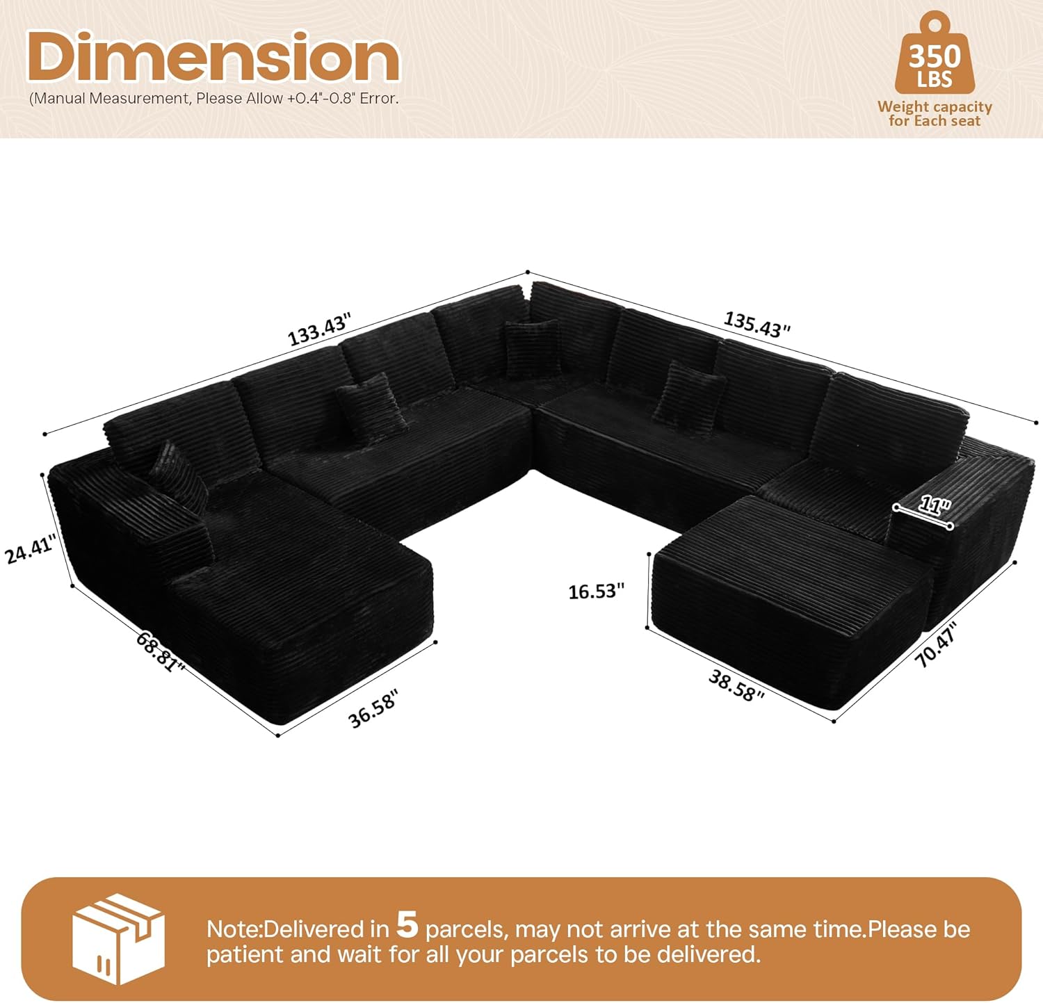 - Product Dimensions : 133"D x 135"W x 24.41"H