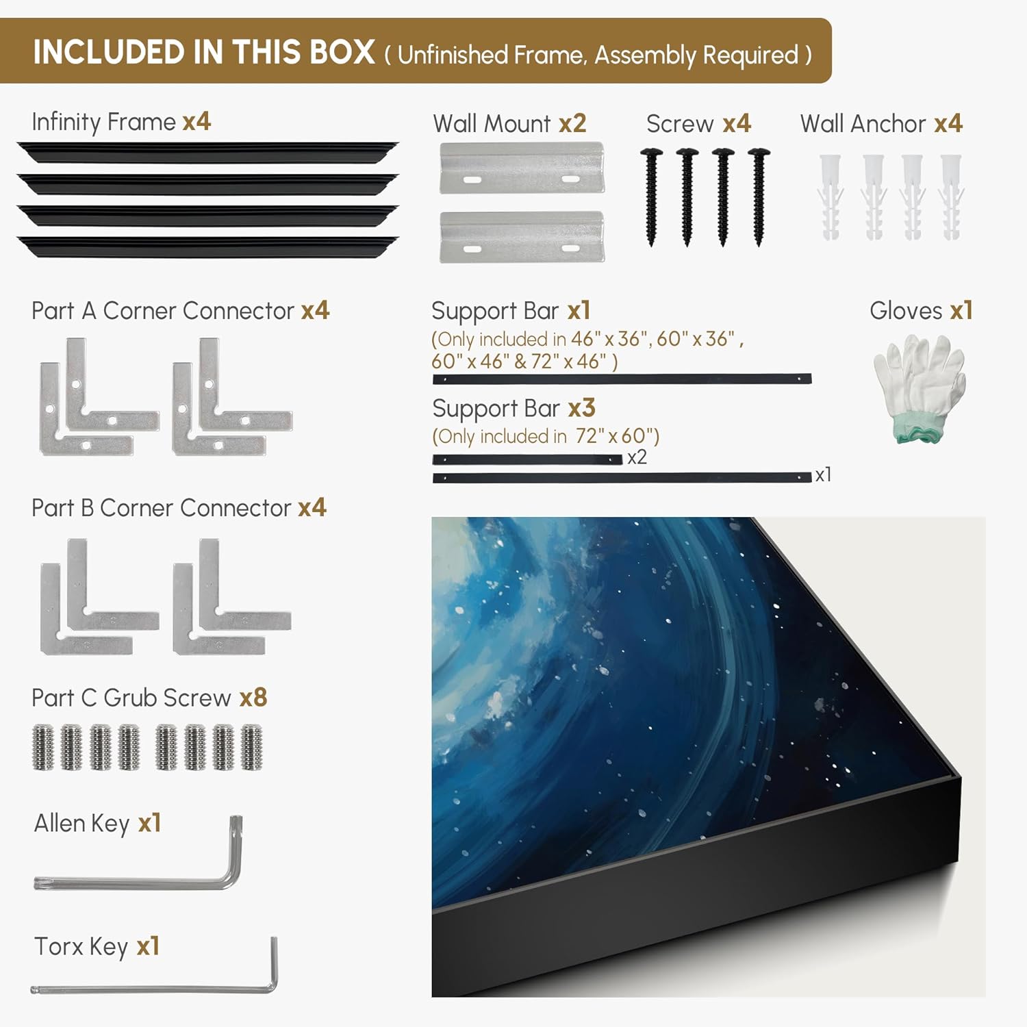 - Assembly Required: The artwork comes with the frame components unassembled. Don¡¯t worry - setup is straightforward and tool-friendly. For best results and accurate alignment, we recommend two people to ensure a smooth assembly and a stable, secure wall mount.