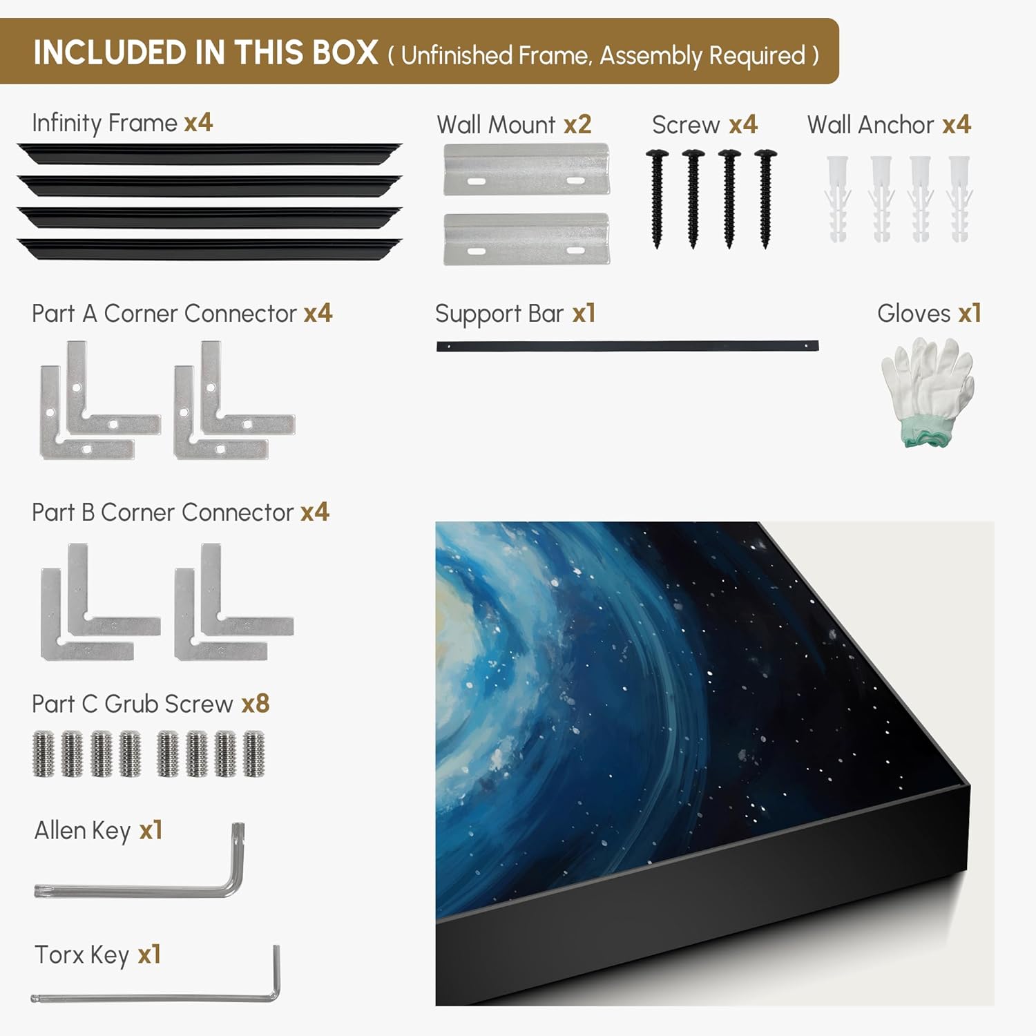 - Assembly Required: The artwork comes with the frame components unassembled. Don¡¯t worry - setup is straightforward and tool-friendly. For best results and accurate alignment, we recommend two people to ensure a smooth assembly and a stable, secure wall mount.