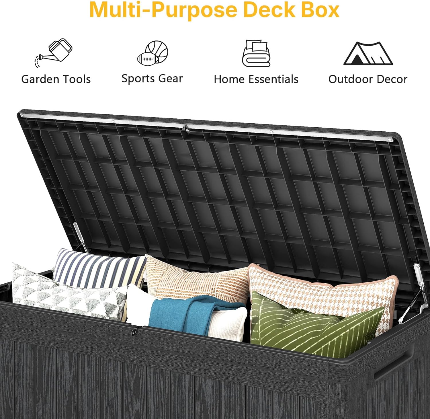 - 【Quick Assembly】230 gallon deck box Designed for instant setup, this deck box assembles in minutes without any tools required. The simple interlocking frame system comes with clearly illustrated instructions for effortless installation right out of the box.