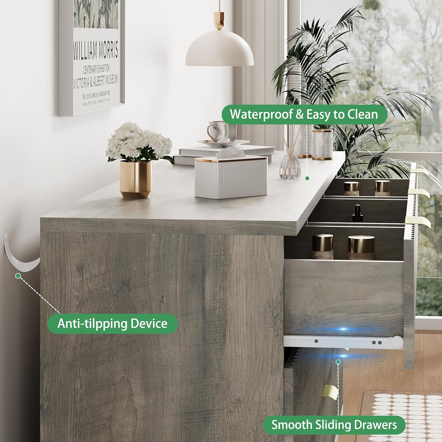 - 【Solid Material & Study Construction】The dressers & chests of drawers are constructed from optimal MDF, P2 engineered wood and coated metal handle which not only has exquisite texture, but also ensure long-term use and scratch resistant. Each drawer holds up to 25 lbs and the thickened tabletop can support up to 180 lbs. For easy cleaning, just wipe with damp cloth and get it air-dried