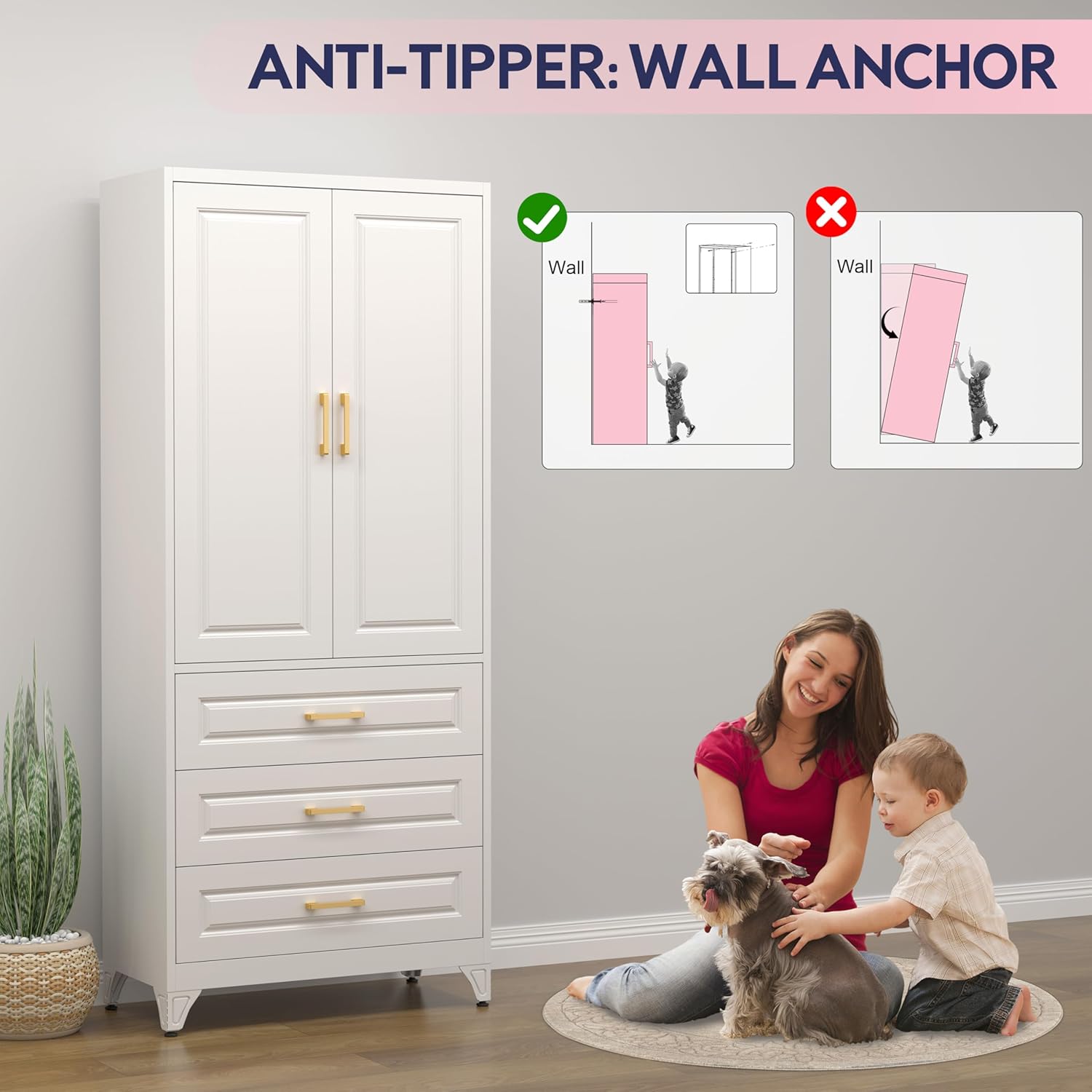 - Secure Anti-Tip Design: Built-in wall mounting holes secure the tall cabinet to prevent tipping and ensure safety around children or pets. Adjustable legs compensate for uneven floors and prevent wobbling. Reliable pantry storage cabinet for kitchens, garages, or home offices