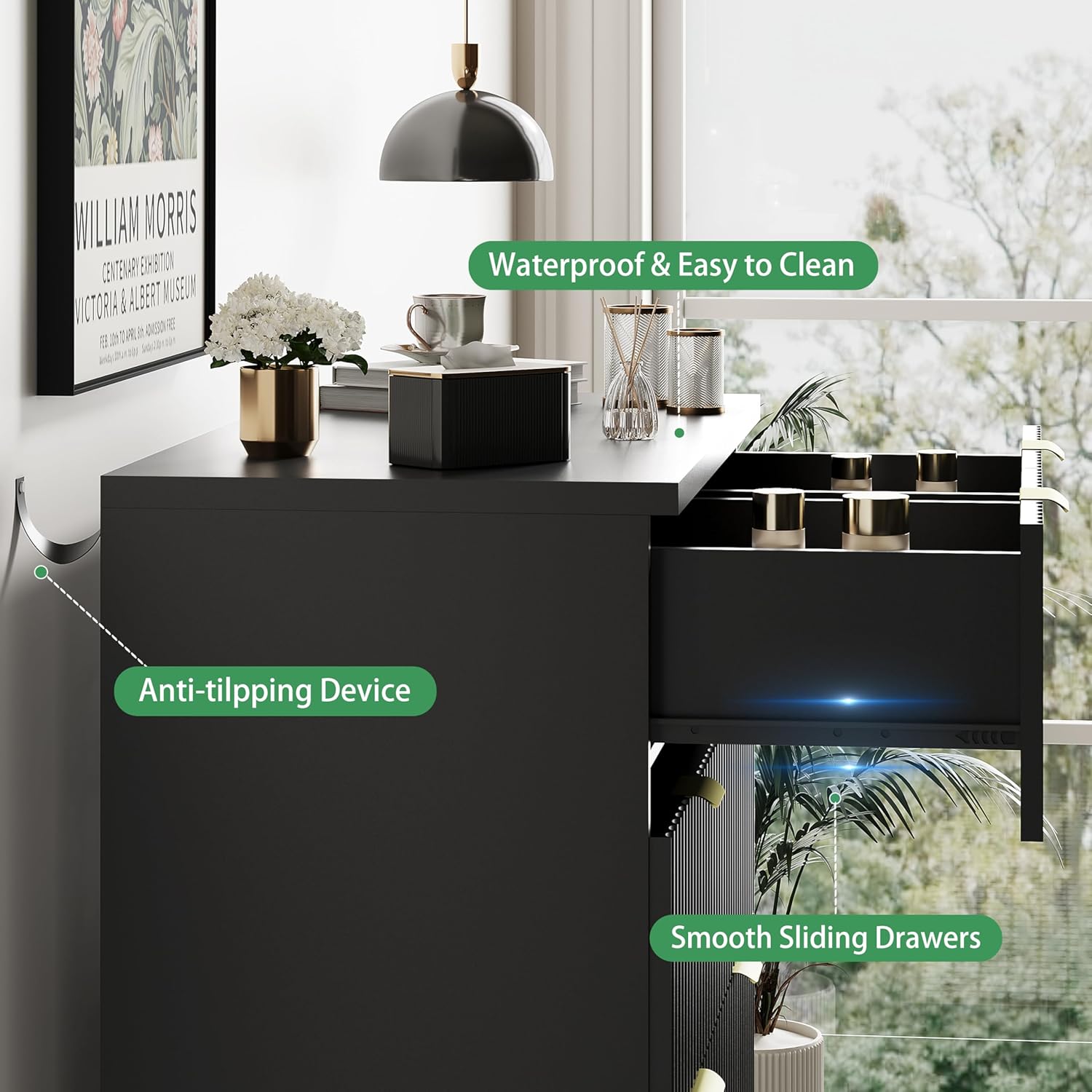 - 【Modern Chic Appearance】The unique wave-like fluted panel enhances the texture and elegance of this bedroom dresser. The thick table top features natural wood grain that complements the black finish. The wide metal handle and splayed base legs add a modern touch, creating a personalized and distinctive appearance