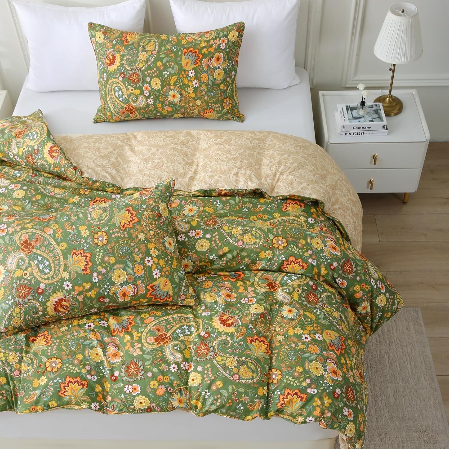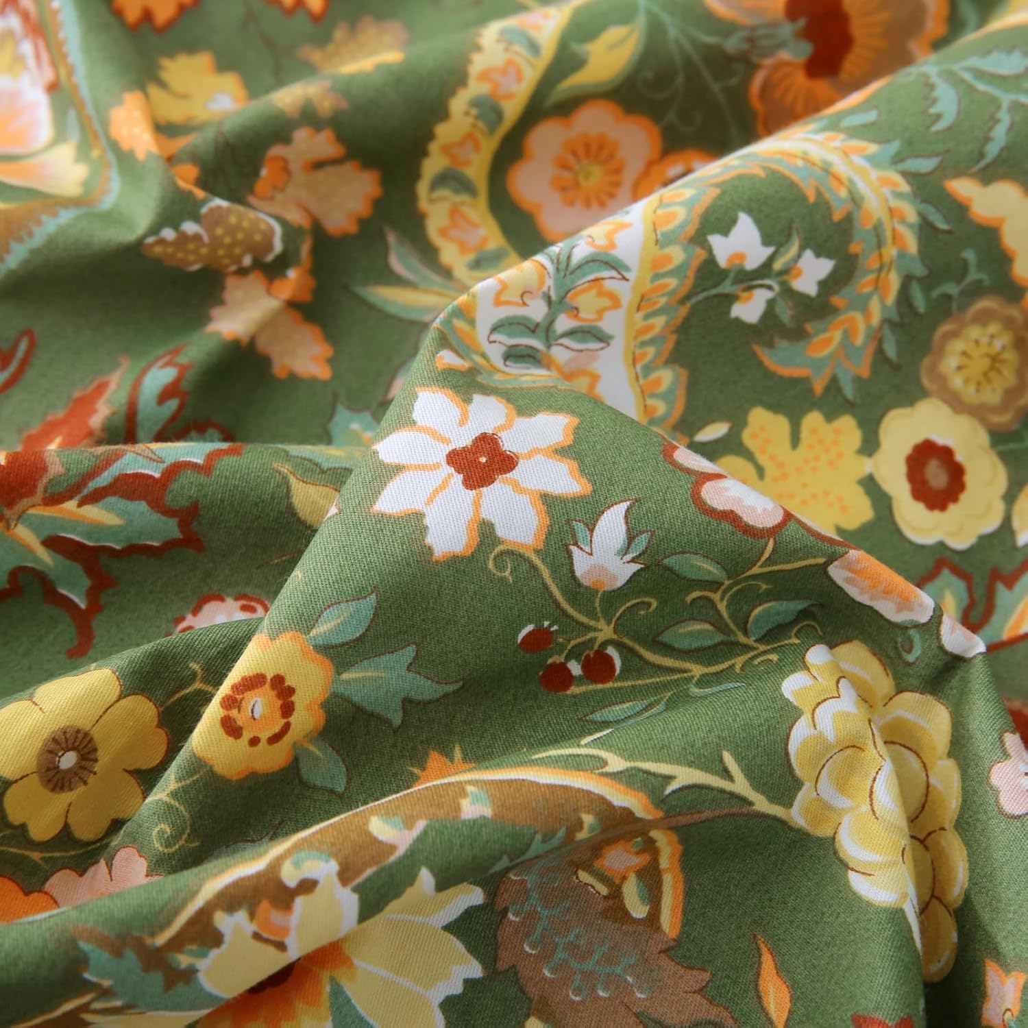 ABREEZE Paisley Bedding Sets 3Pcs Brushed Cotton Duvet Cover Set Queen Size Rustic Damask Green Floral Comforter Cover with Zipper Closure Boho Bedding Collections