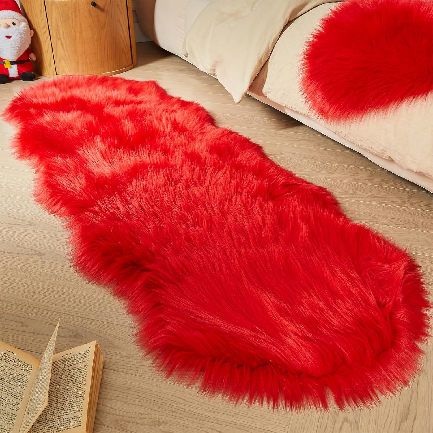 AMTOVO Faux Sheepskin Rug, Red Ultra Soft Fluffy Shag Area Rug, 2 x 6 ft Faux Fur Rug for Bedroom Sofa Throw Cushion Room Decor, Sheepskin