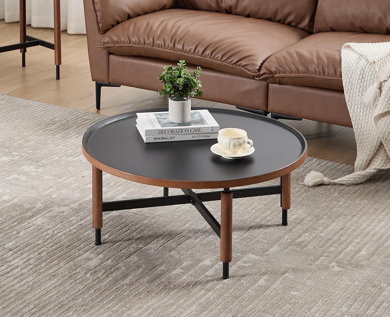EALSON 31.25" Round Coffee Table Mid Century Modern Coffee Tables with Black Metal Legs/Wooden Top Circle Accent Center Table for Living Room Reception Apartment Office,Walnut