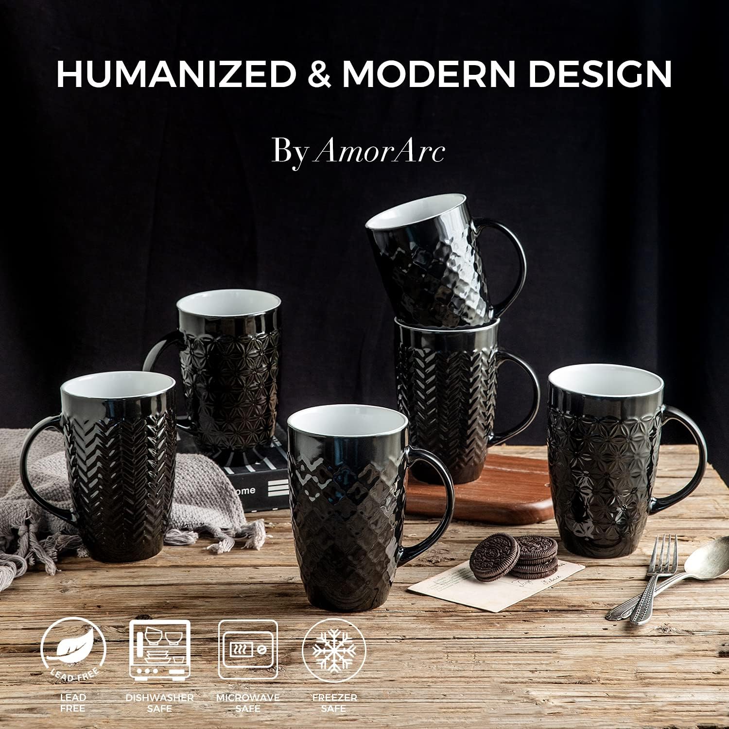 AmorArc Large Coffee Mugs Set of 6, 20oz Ceramic Tall Coffee Mugs Set with Textured Geometric Patterns for Latte/Tea/Beer/Hot Cocoa, Dishwasher & Microwave Safe, Black