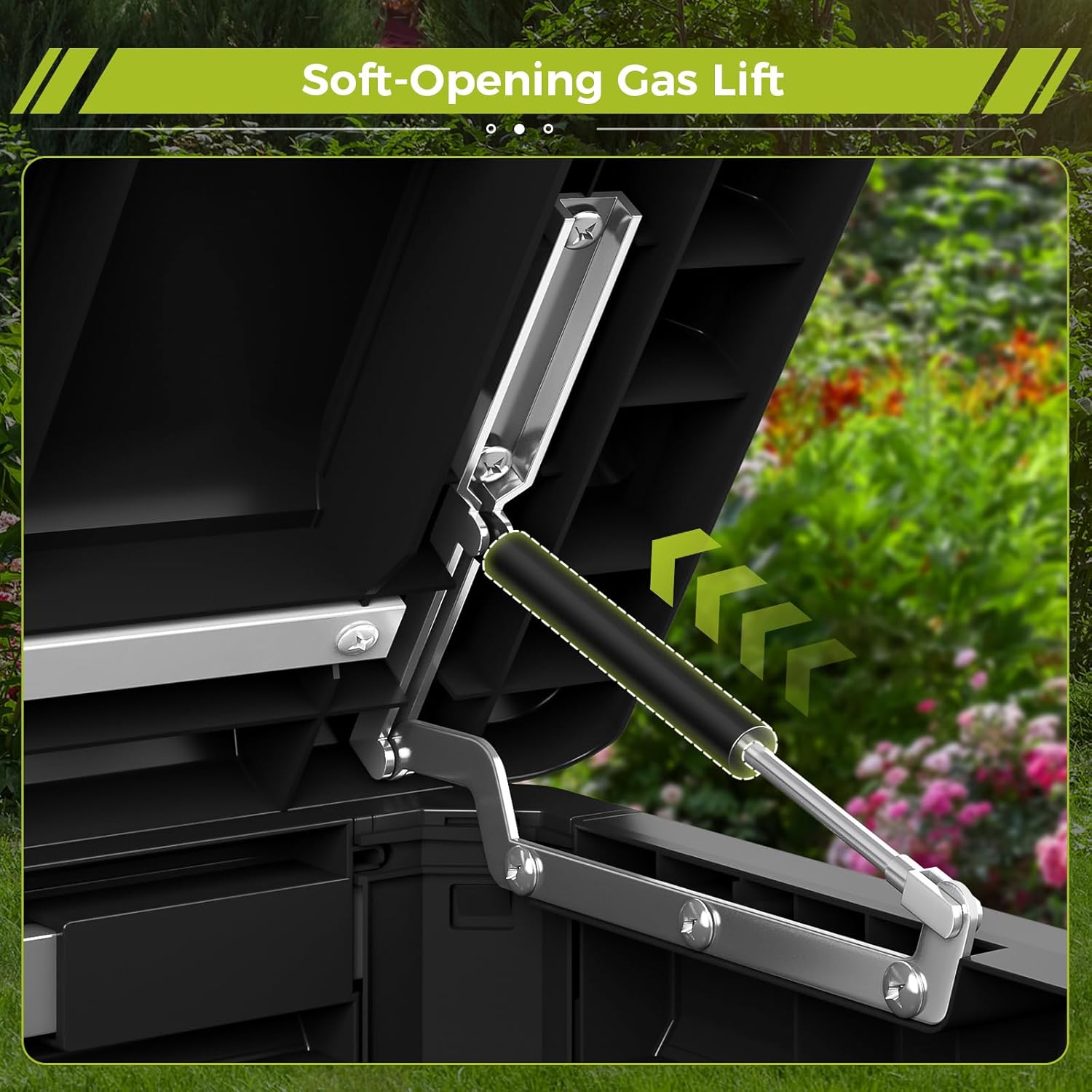 - 【Secure & Smooth Access】 Designed with a soft-closing hydraulic lid to prevent sudden slams and equipped with reinforced latch points (lock not included), this outdoor resin patio box keeps items safely stored and easily reachable