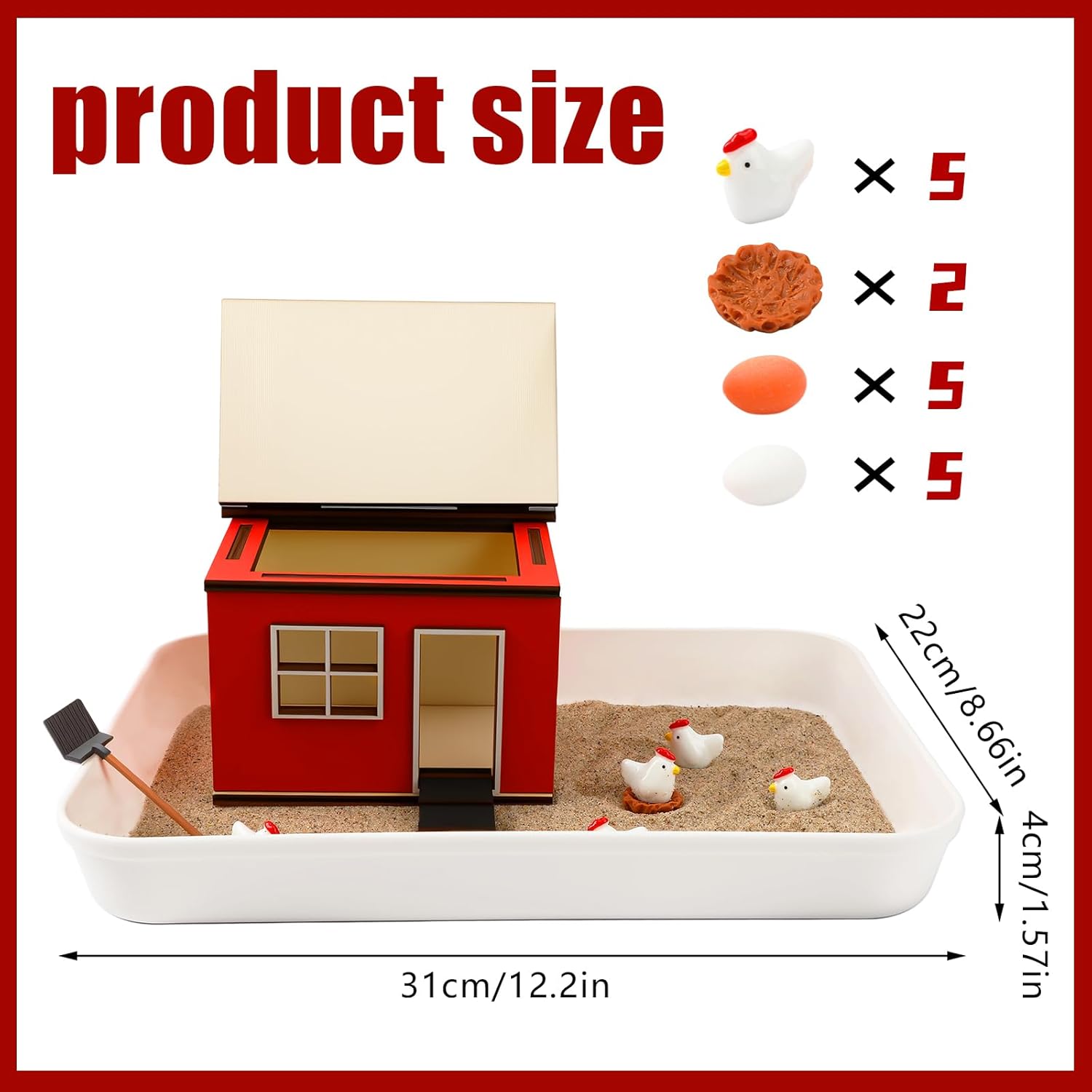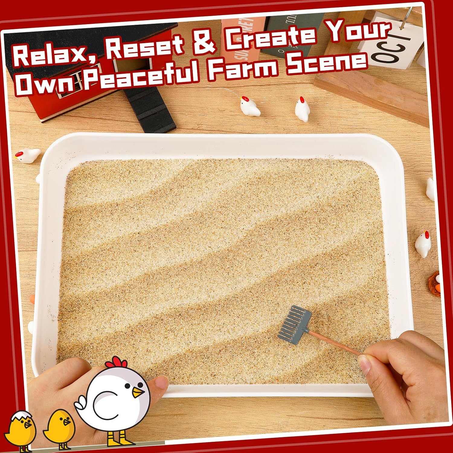 - DIY Stress Relief Activity: Take a mindful break and build your own little farm. Assemble the barn, arrange the chickens and eggs, and rake the sand to create soothing patterns. This interactive zen garden is perfect for sparking creativity, relieving tension, and giving your brain a gentle reset anytime during your busy day.
