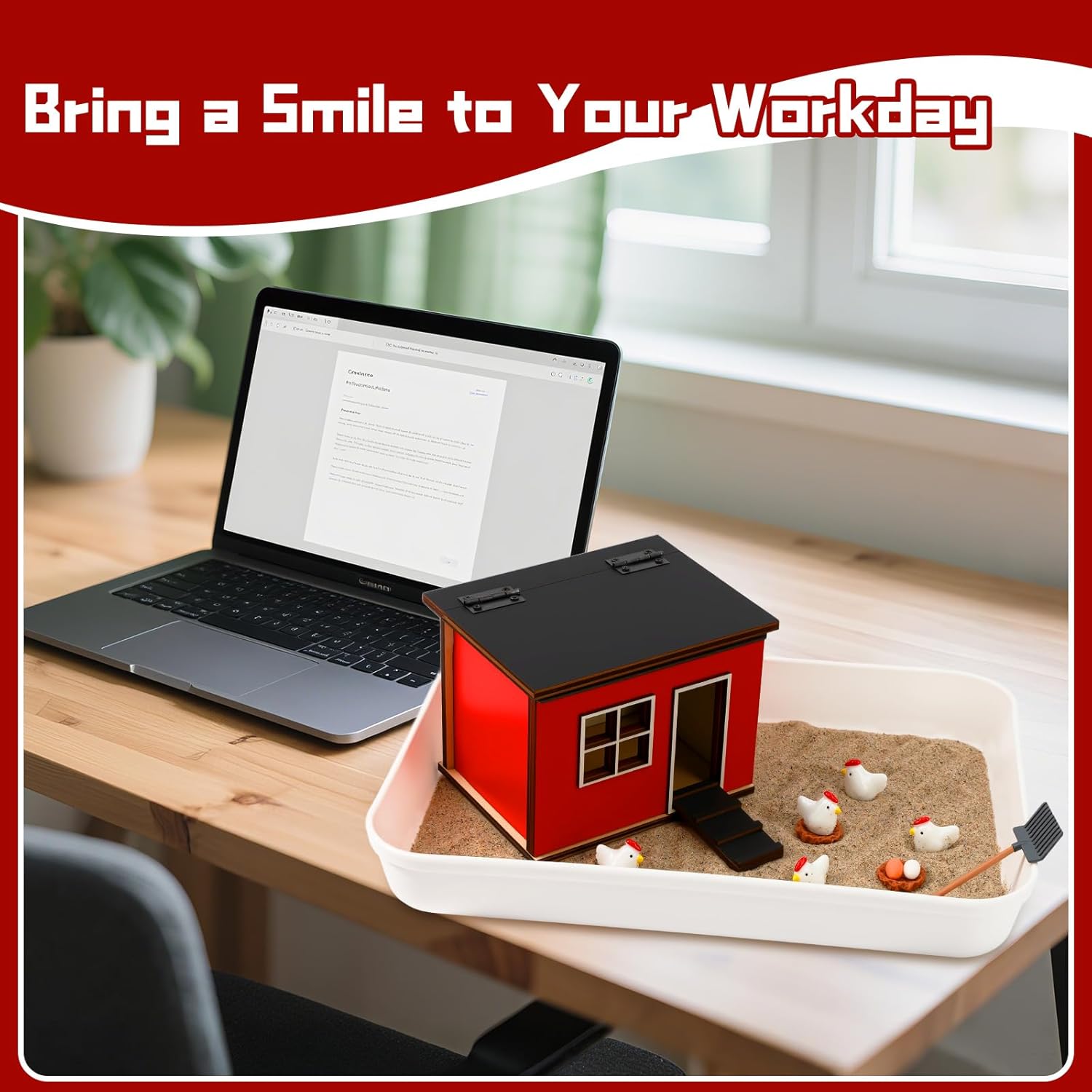 - Farm-Themed Zen Garden Set: Find a moment of calm in the chaos with this adorable farm-style zen garden! Featuring a buildable red wooden barn, detailed resin hens, eggs, a cozy nest, and a bag of fine sand, this mini farm scene brings peaceful rural vibes to your workspace. Whether you’re a farm lover or just need a break from stress, it’s a fun way to unwind and smile.