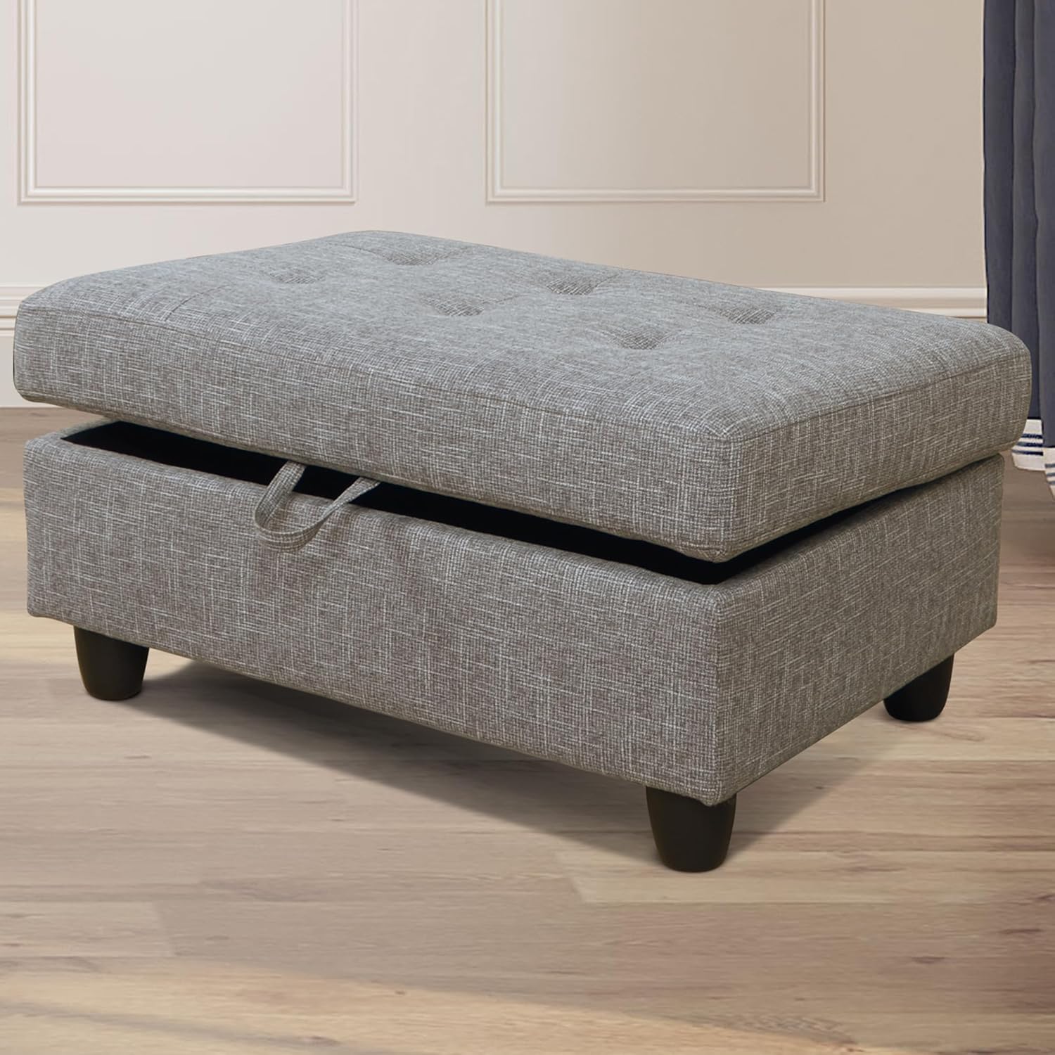 - AMPLE STORAGE: This ottoman offers generous storage capacity for items like pillows, blankets, shoes, seasonal decor, books, toys, and more. Designed with convenient hinges, the lid stays open smoothly and closes gently with a soft-close mechanism. Ideal for organizing your living space.