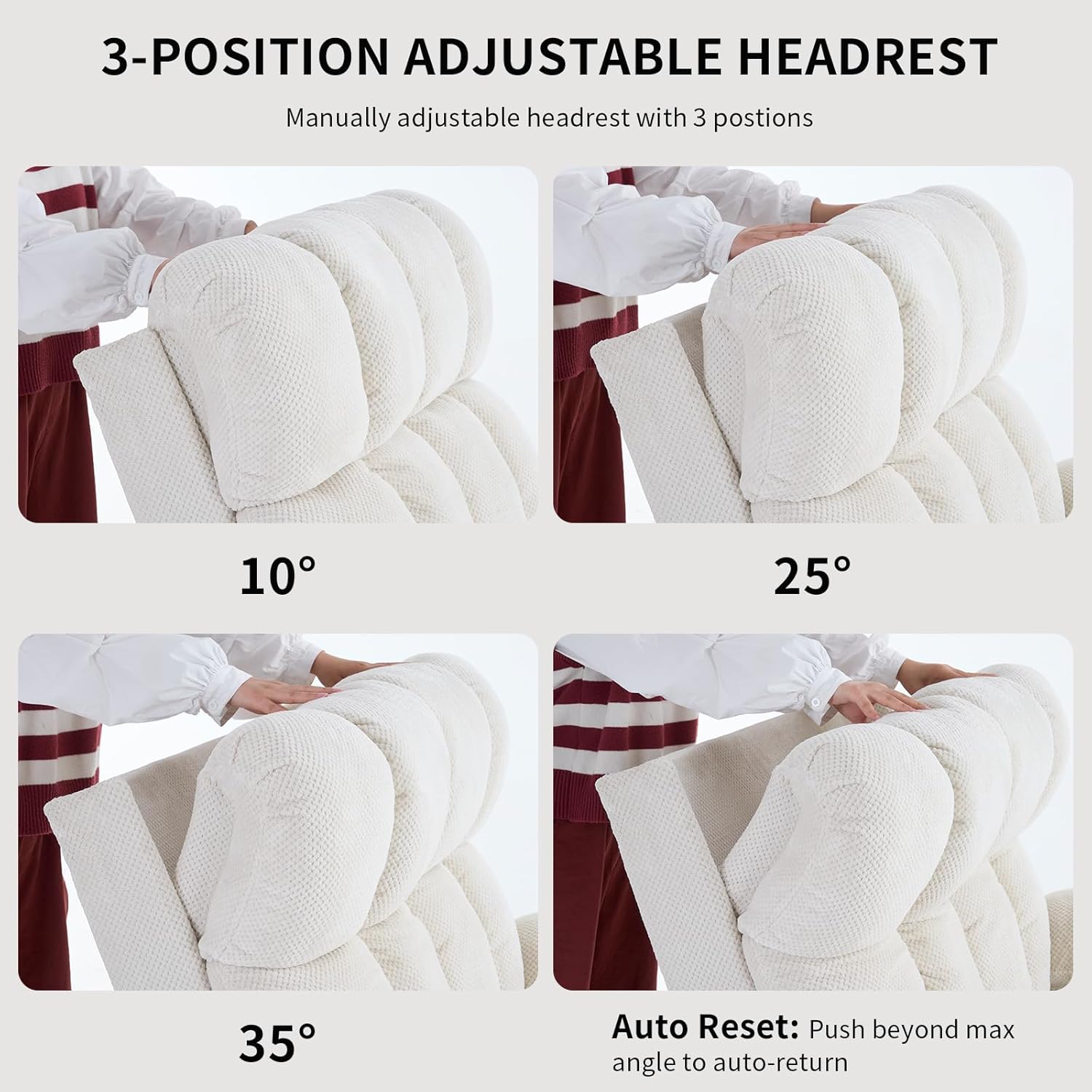 - Manual Headrest adjustment: Electric recliner chairs with adjustable headrests, There are three adjustable levels in total:10°,25°,35°. You can adjust different angles according to your application scenarios. allowing you to watch TV or lean back without straining your neck or head, for personalized comfort