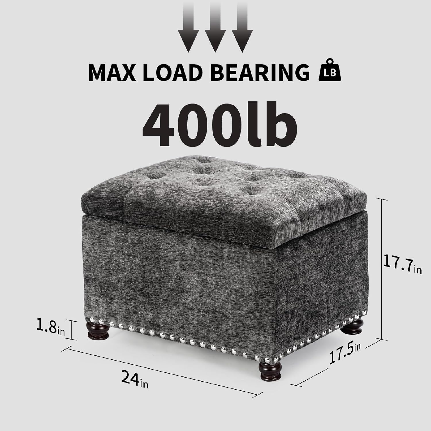 - 【Spacious Ottoman with Storage – Declutter in Style】Overall Dimensions: 24"L x 17.5"W x 17.7"H;Interior Storage: 21"L x 14.5"W x 12.5"H. This ottoman with storage offers generous space to neatly stow away throw blankets, pillows, books, or other everyday items. As a practical storage ottoman bench for your living room, it helps keep clutter out of sight while doubling as a charming ottoman foot rest.