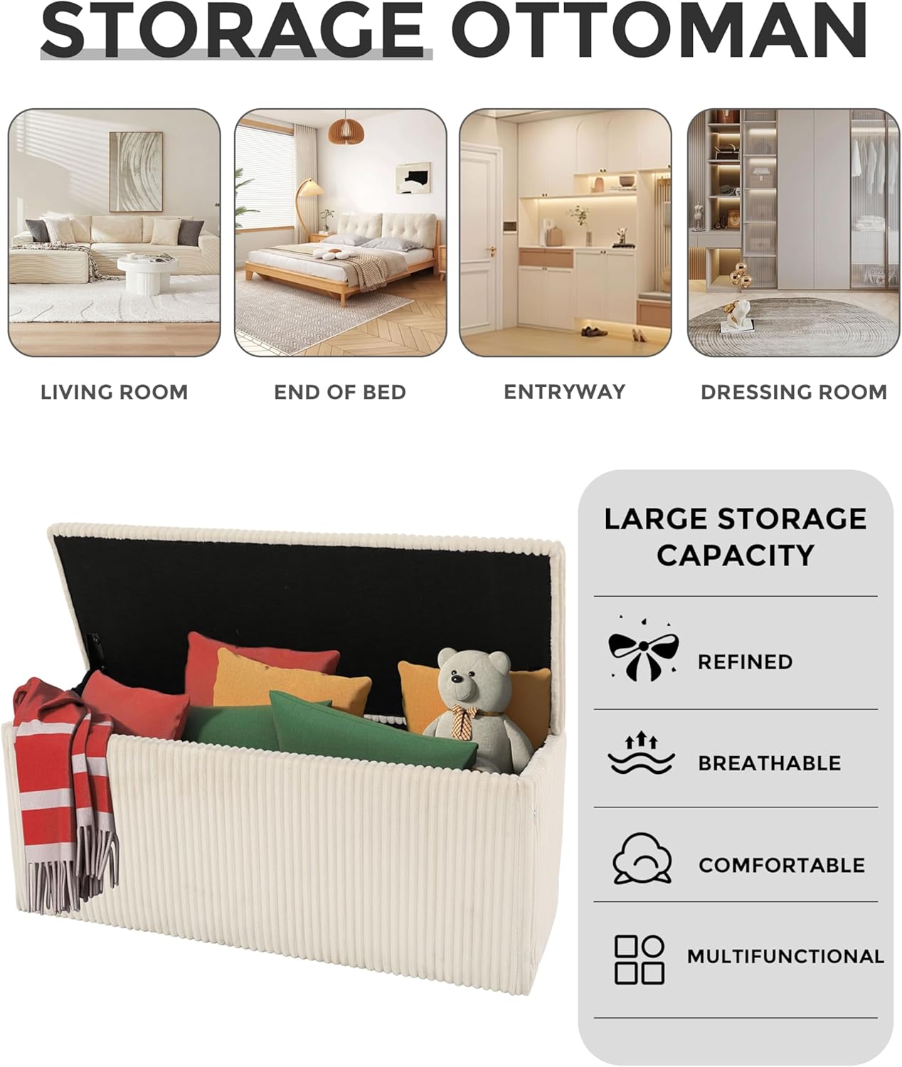 - 𝐌𝐔𝐋𝐓𝐈𝐅𝐔𝐍𝐂𝐓𝐈𝐎𝐍𝐀𝐋 𝐅𝐎𝐑 𝐀𝐍𝐘 𝐑𝐎𝐎𝐌: Use our ottoman bench as a footrest in the living room, a window seat in the bedroom, a shoe bench at the entryway, or toy storage in the playroom. This storage ottoman bench adapts to any space — ideal for apartments, dorms, RVs, and large family homes alike.