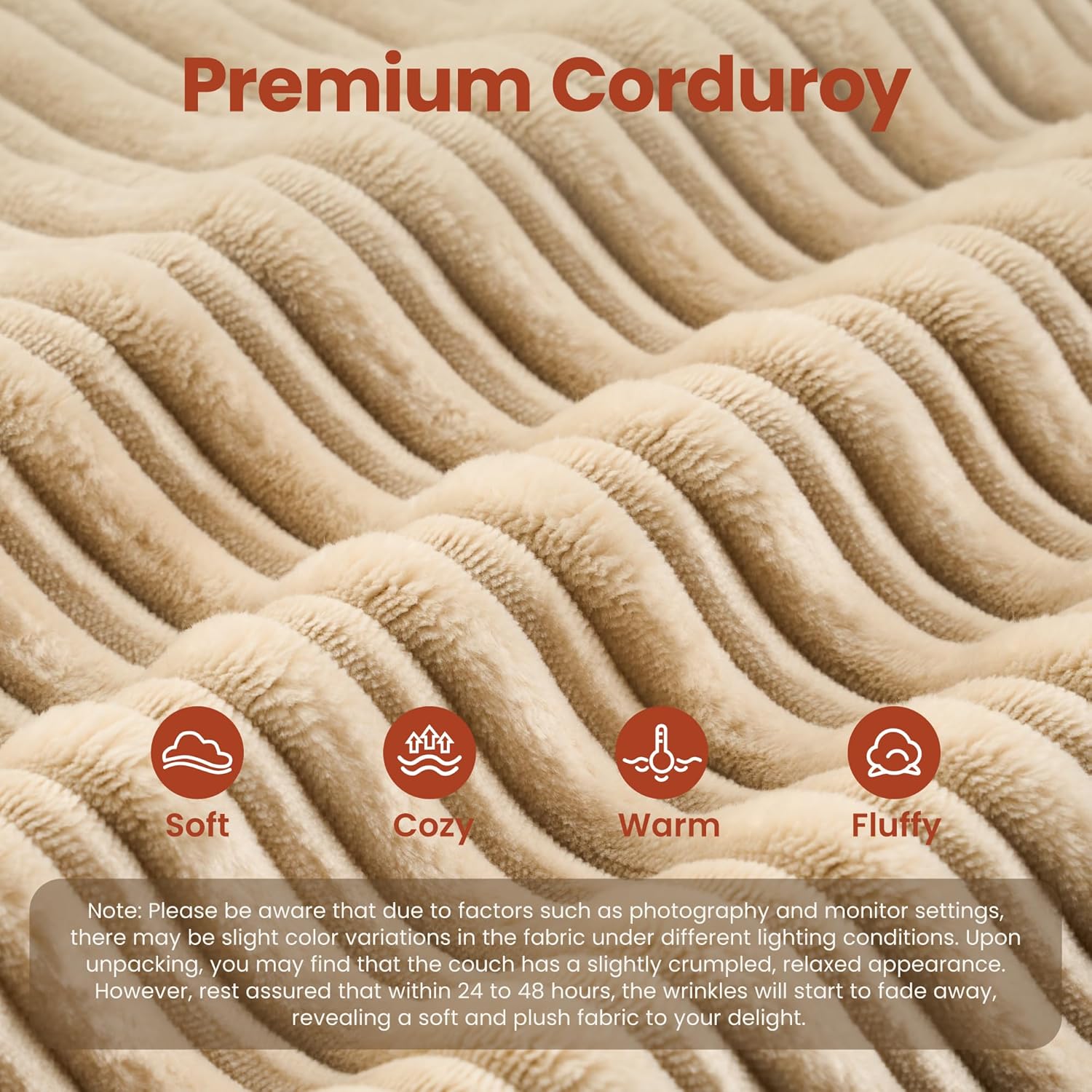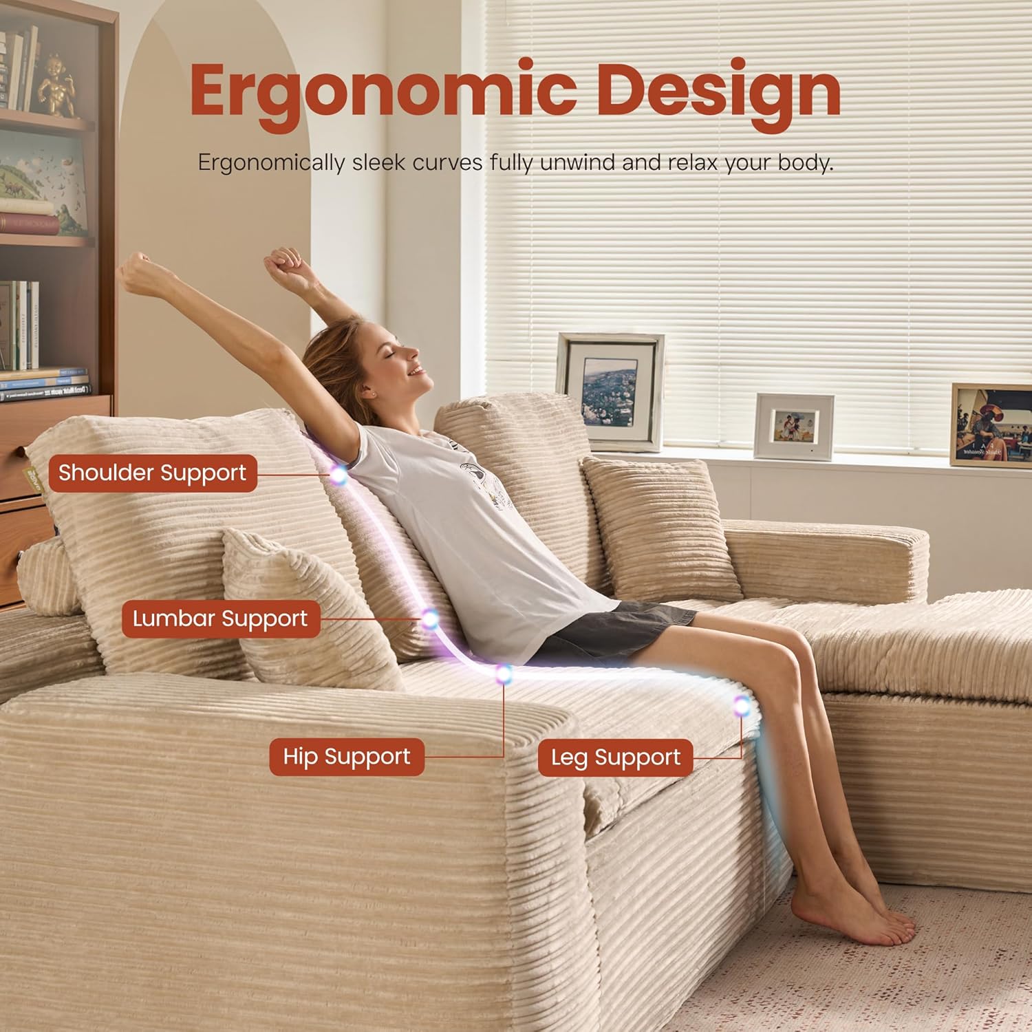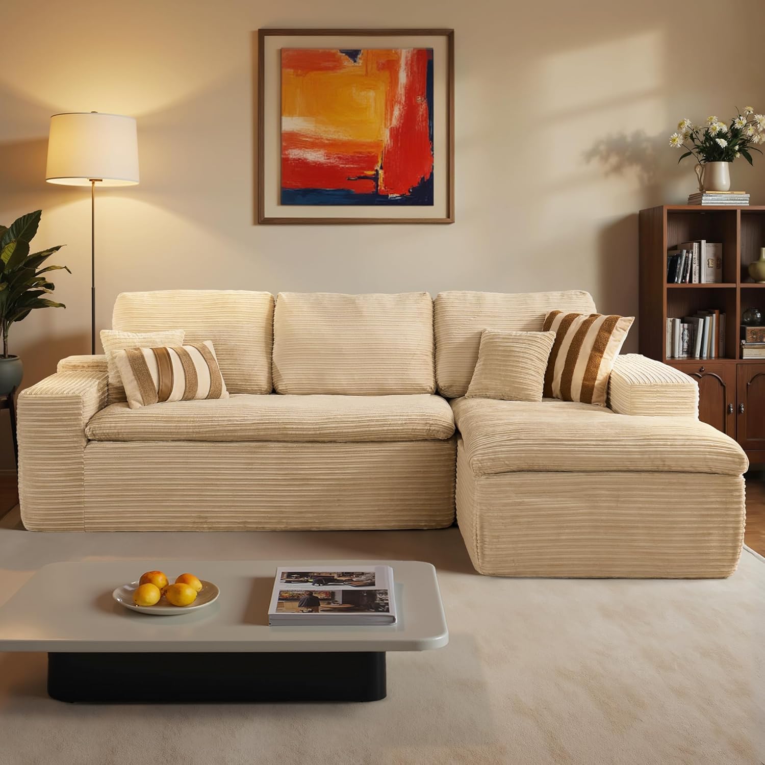 - Corduroy Fabric:Experience the lavish comfort of our enhanced corduroy fabric, offering unmatched softness and warmth. Its impressive durability and stain-fighting prowess keep your sofas looking fresh and lively. With a variety of color choices, our corduroy chaise sofa lets you showcase your unique style while adding irresistible charm to your space