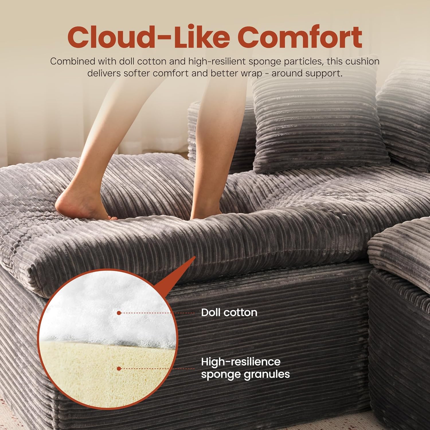 - Corduroy Fabric:Experience the lavish comfort of our enhanced corduroy fabric, offering unmatched softness and warmth. Its impressive durability and stain-fighting prowess keep your sofas looking fresh and lively. With a variety of color choices, our corduroy chaise sofa lets you showcase your unique style while adding irresistible charm to your space