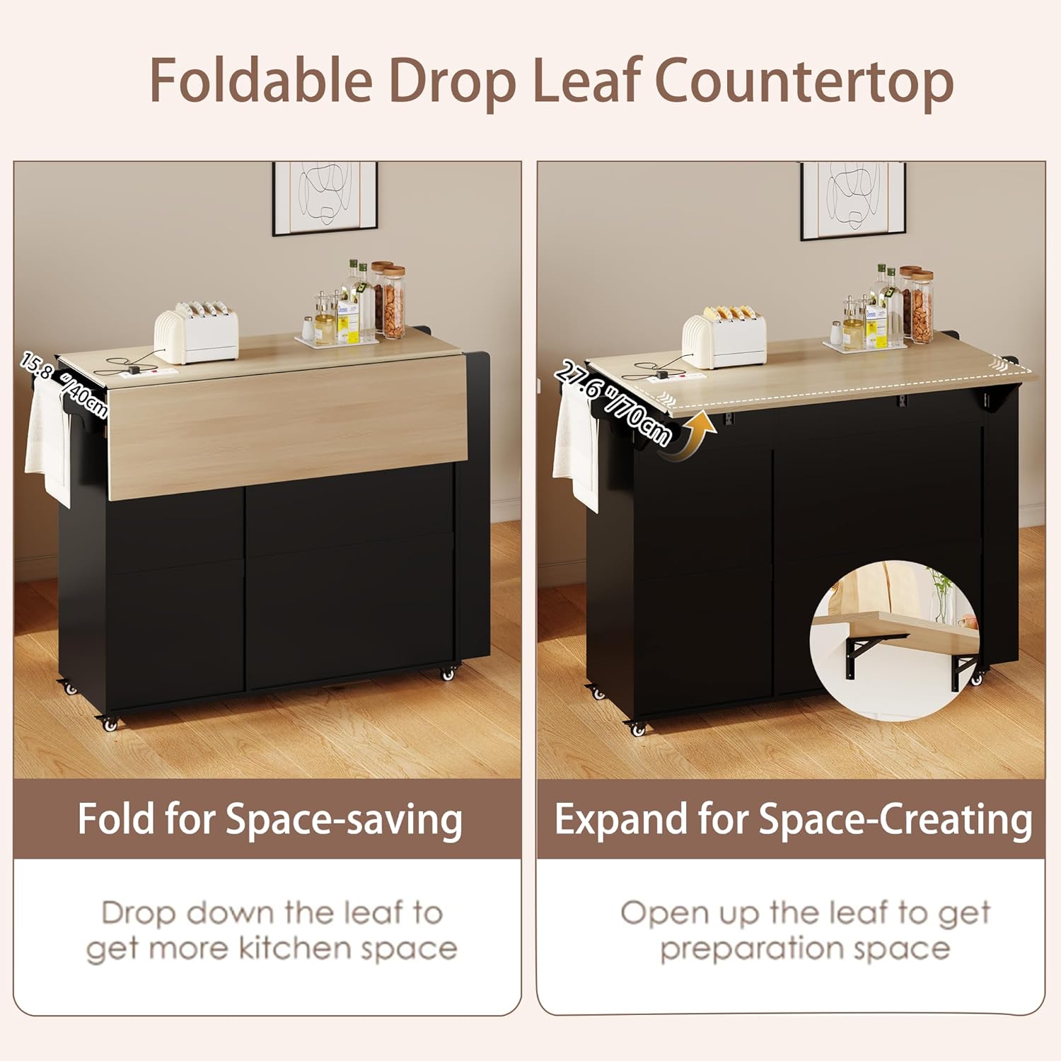 - Foldable Countertop: The modern white kitchen island includes a foldable drop-leaf countertop that seamlessly adapts to your kitchen. When extended, the surface doubles to 27.6 inches, creating ample room for dining (6-8 people) or a coffee bar. This mobile kitchen cart is perfect for entertaining and ideal for compact apartments or limited spaces.