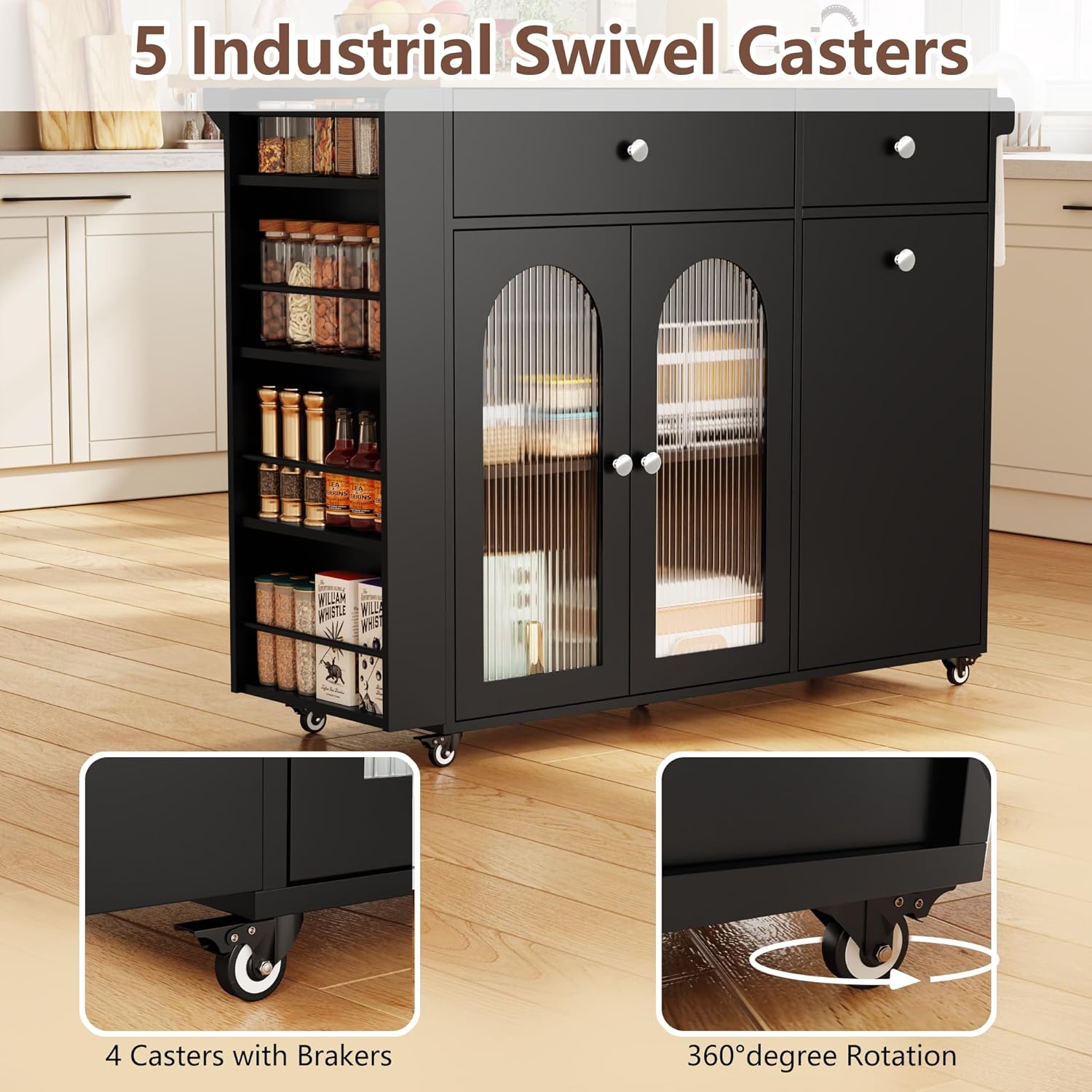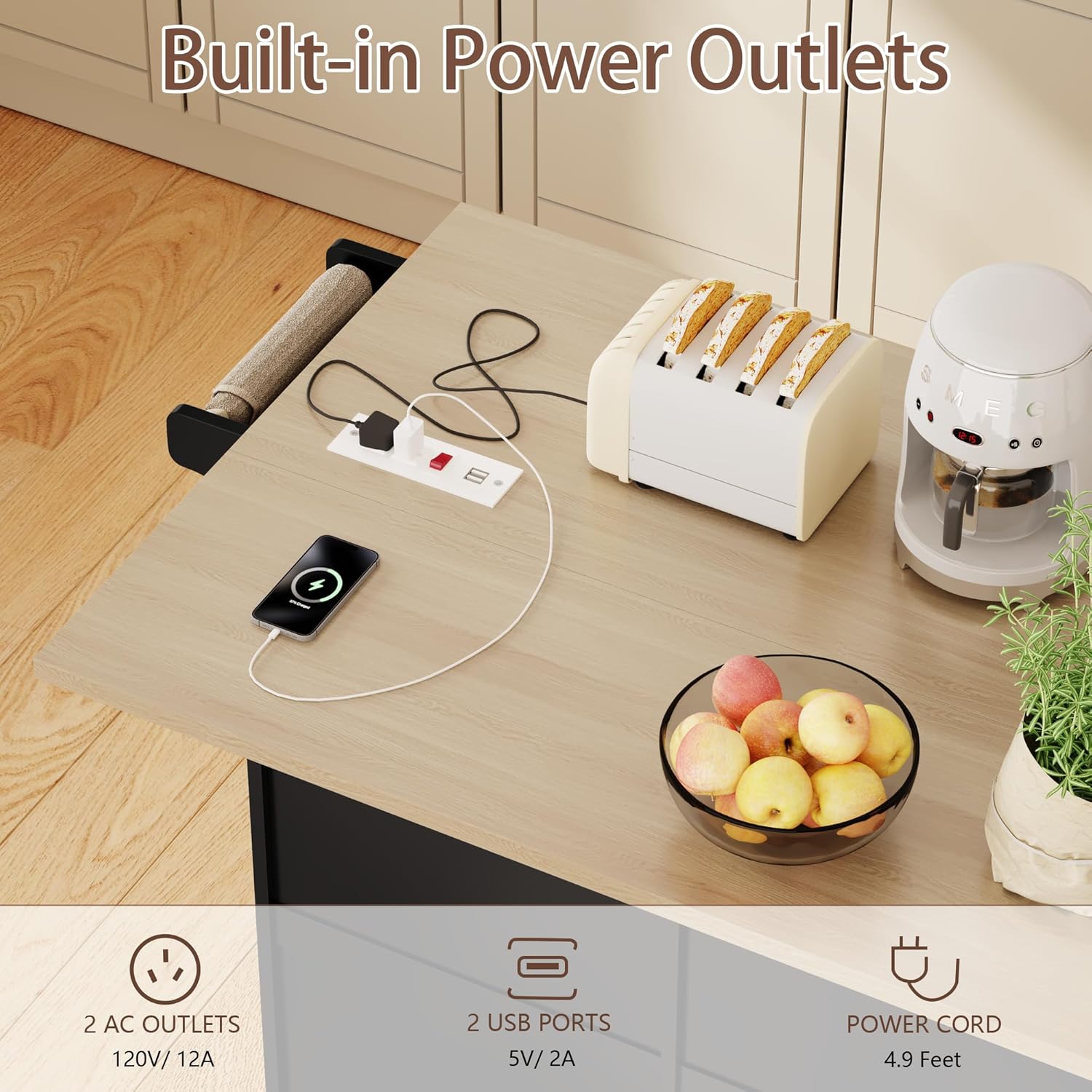 - Kitchen Island with Power Outlet: This kitchen carts on wheels is equipped with a 4.9ft cord, 2 AC outlets, and 2 USB ports; this kitchen island with storage provides easy access to power. Effortlessly charge or operate appliances like coffee makers, microwaves, or toasters right at the cart, enhancing cooking convenience.