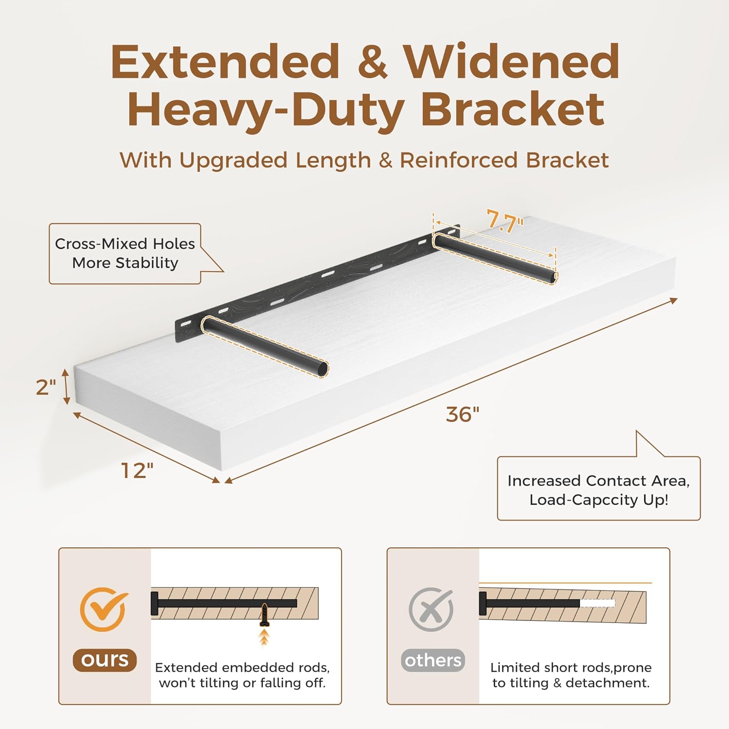 White Floating Shelves 36 Inch Long, 12 Inch Deep Floating Shelves for Wall, 36 x 12 Shelves for Wall Storage & Display, 2" Thick Floating Shelf for Bathroom, Living Room, Bedroom, Set of 1