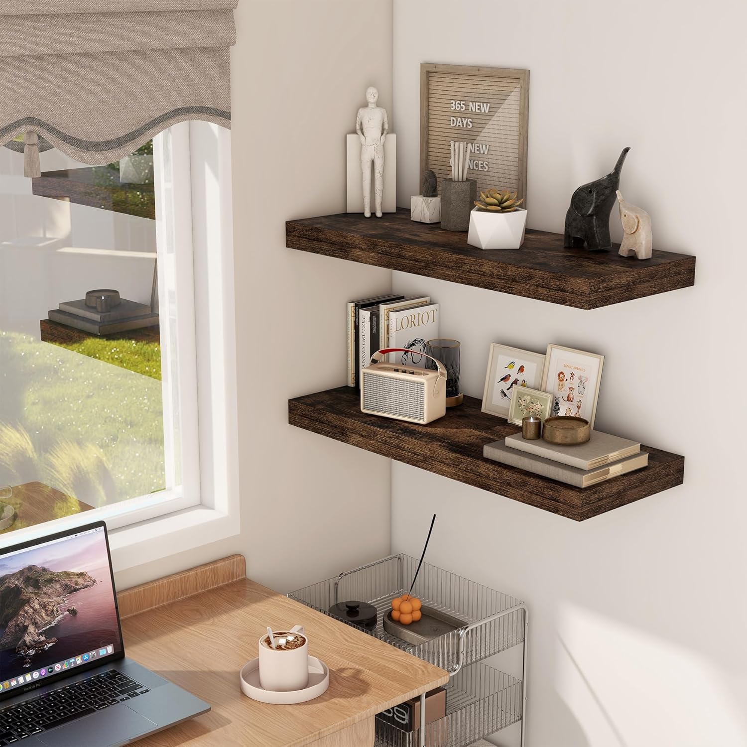 - 【FARMHOUSE RUSTIC WALL SHELF】These floating shelves are made of premium engineered wood board and invisible one-piece bracket. The rustic wooden grain surface add character and warmth to any modern or traditional interior with these thick floating shelves, contrast shelves at staggering heights on the wall or mount side-by-side or in the corner for a clean streamlined look.