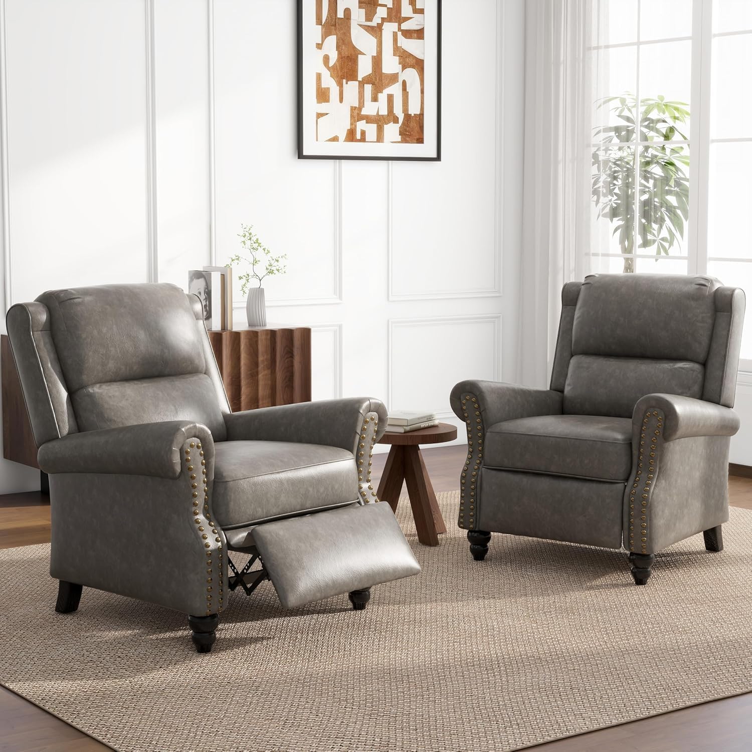 UIXE Pushback Recliner Chairs Set of 2, Faux Leather Armchair Push Back Accent Chair for Living Room, Rivet Trim Club Arm Chair Overstuffed Home Theater Single Sofa Reading Seat with Footrest - Gray