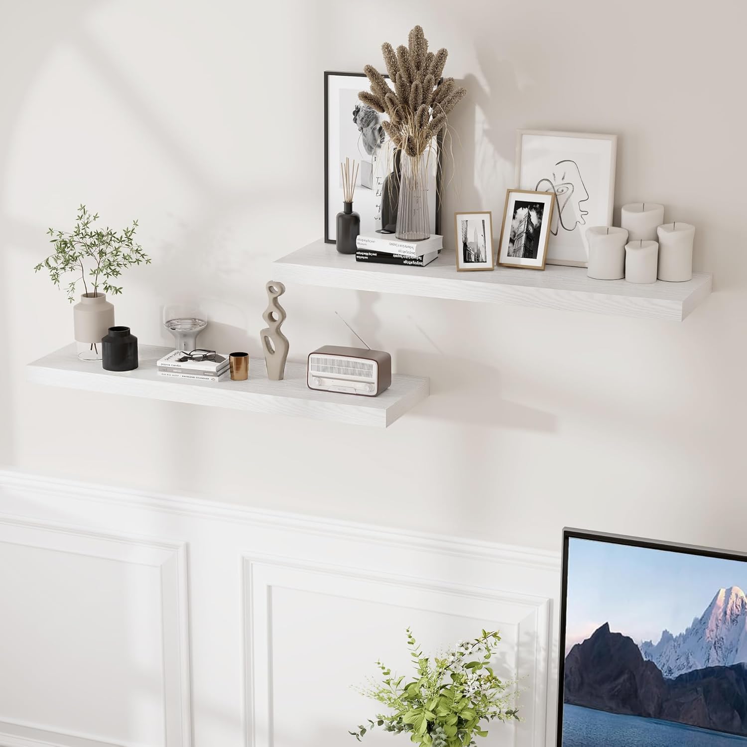 - 【DECORATIVE & FUNCTIONAL】The wall-mounted floating shelves are designed for decoration and storage, utilizing and decorating any space in your home. Used as shelf decor to show your collection, books, or prize, the hanging shelves are perfect for displaying your photo frame, small plants, model, or audio in your living room, office, study. And can also use as over the toilet storage shelf in the bathroom to hold toiletries or used as kitchen shelf to storage condiments.