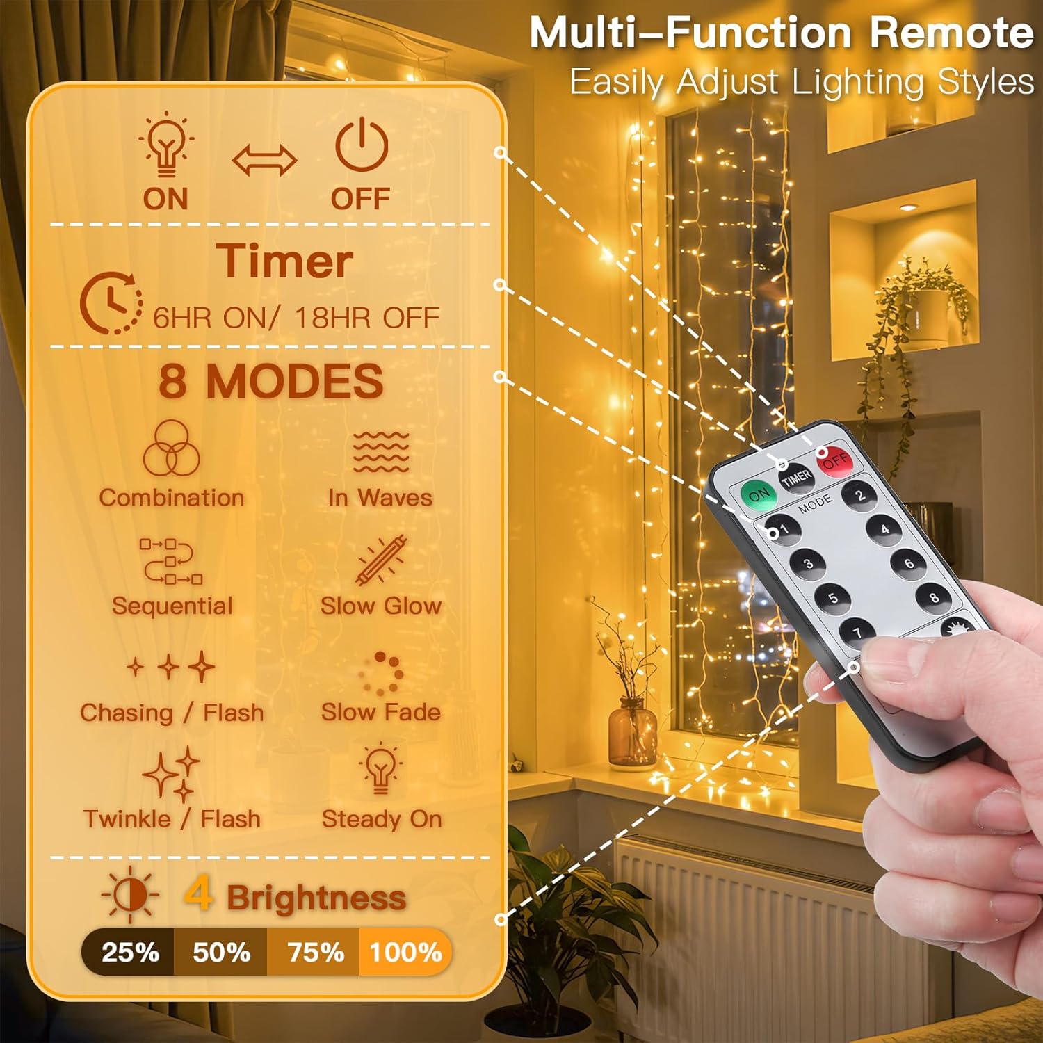 - Versatile Remote Control:Our twinkle lights have 8 lighting modes, 4 brightness levels, and 6H on/18H off timer settings. Simply press the corresponding button on the remote control to easily switch lighting modes and meet different lighting requirements.