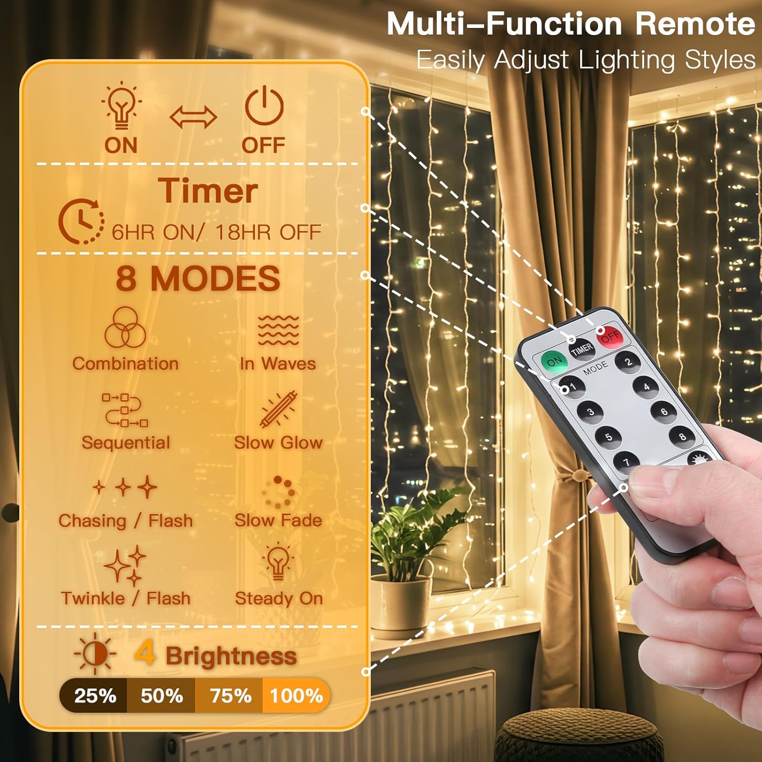 - Versatile Remote Control:Our twinkle lights have 8 lighting modes, 4 brightness levels, and 6H on/18H off timer settings. Simply press the corresponding button on the remote control to easily switch lighting modes and meet different lighting requirements.