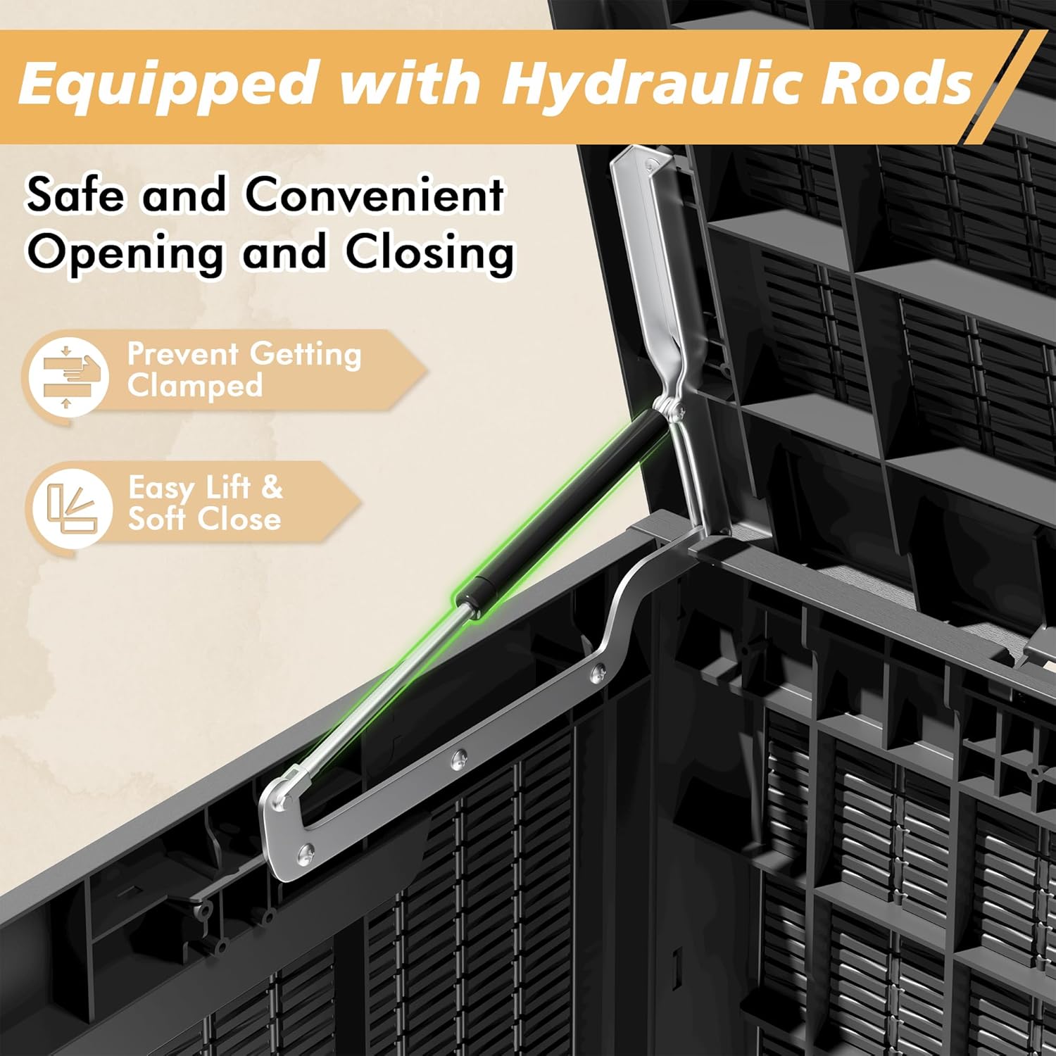- ๐ Hydraulic Lid with Lockable Design for Safe Access Equipped with hydraulic gas lift rods, the lid opens smoothly and closes gently to prevent pinched fingers. The lockable lid adds an extra layer of security, making it an ideal choice for shared outdoor spaces or secure backyard storage. (Lock not included)