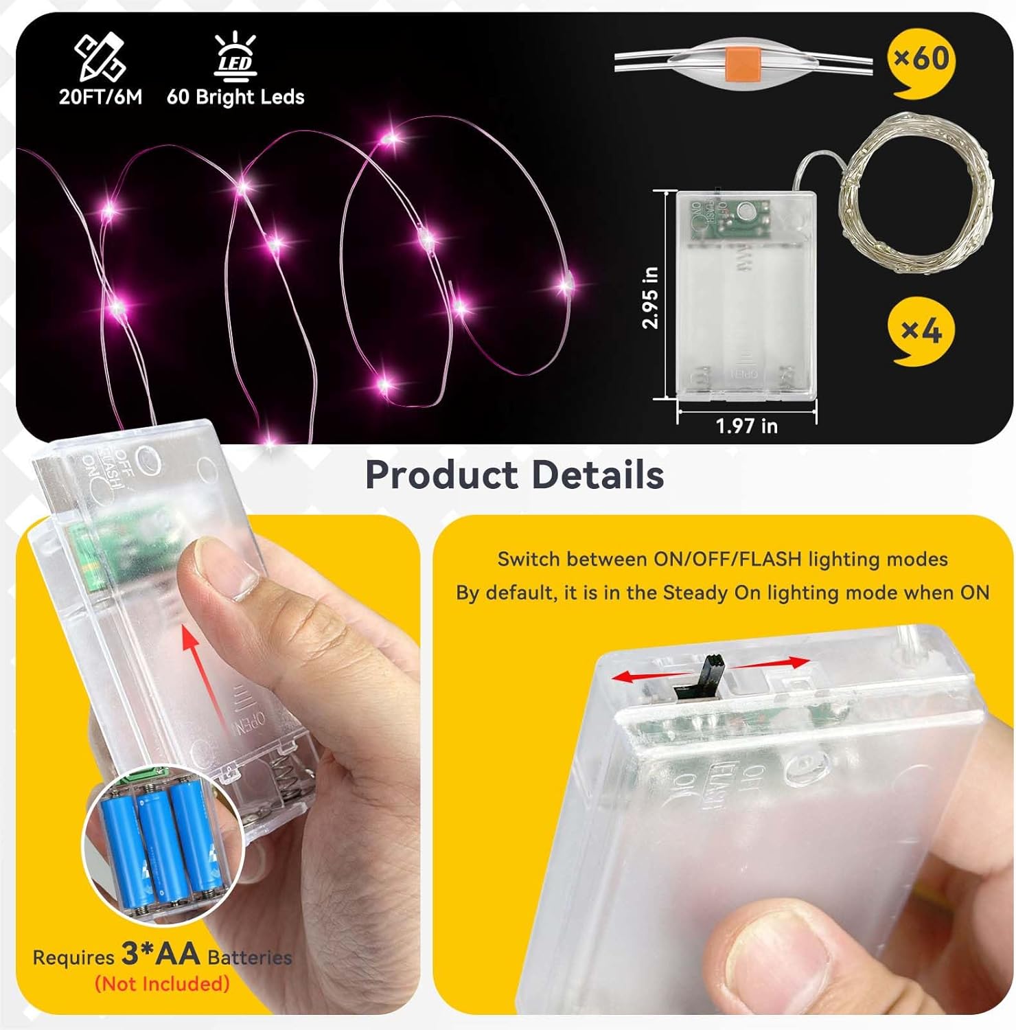 4 Pack 60LED Christmas Fairy Lights Battery Operated - 20FT Twinkle Lights with 2 Lighting Modes Indoor Outdoor, Waterproof Led Fairy String Lights for Bedroom, Wedding, Dorm, DIY Decor, Pink