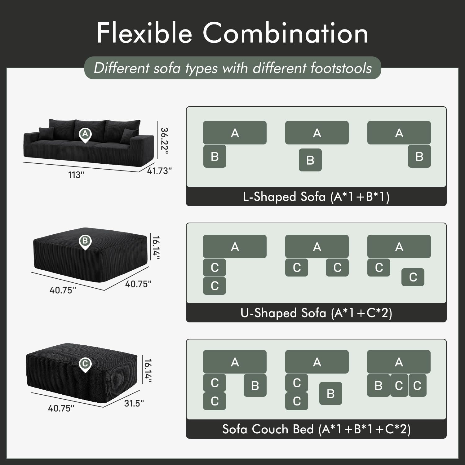 Boneless Sectional Cloud Couch Sofa for Living Room, 112" L-Shaped Modular Modern Lounge Sleeper Black Couches with Chaise, No Assemble, Cordury Compression Upholstered Sofas