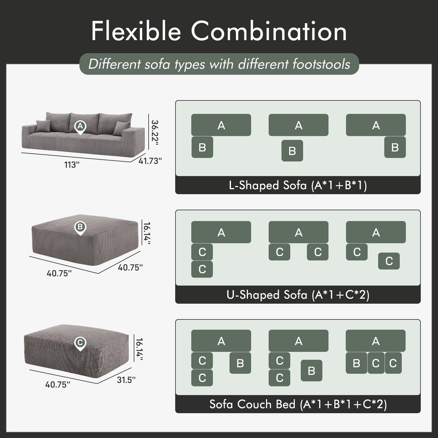 Boneless Sectional Cloud Couch Sofa Bed for Living Room, 112" Modular Modern Lounge 3 Seater Sleeper Grey Couches with Chaise, No Assemble, Cordury Compression Upholstered Sofas
