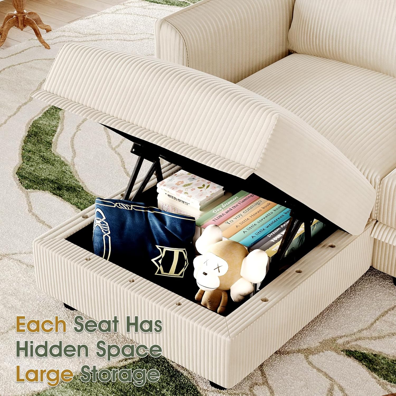- Hidden Storage Space: Every seat includes a spacious hidden storage compartment (20.5" x 20.5" x 6.3"), perfect for storing blankets, pillows, board games, decorations, and more. Keep your living space organized and clutter-free while maximizing functionality