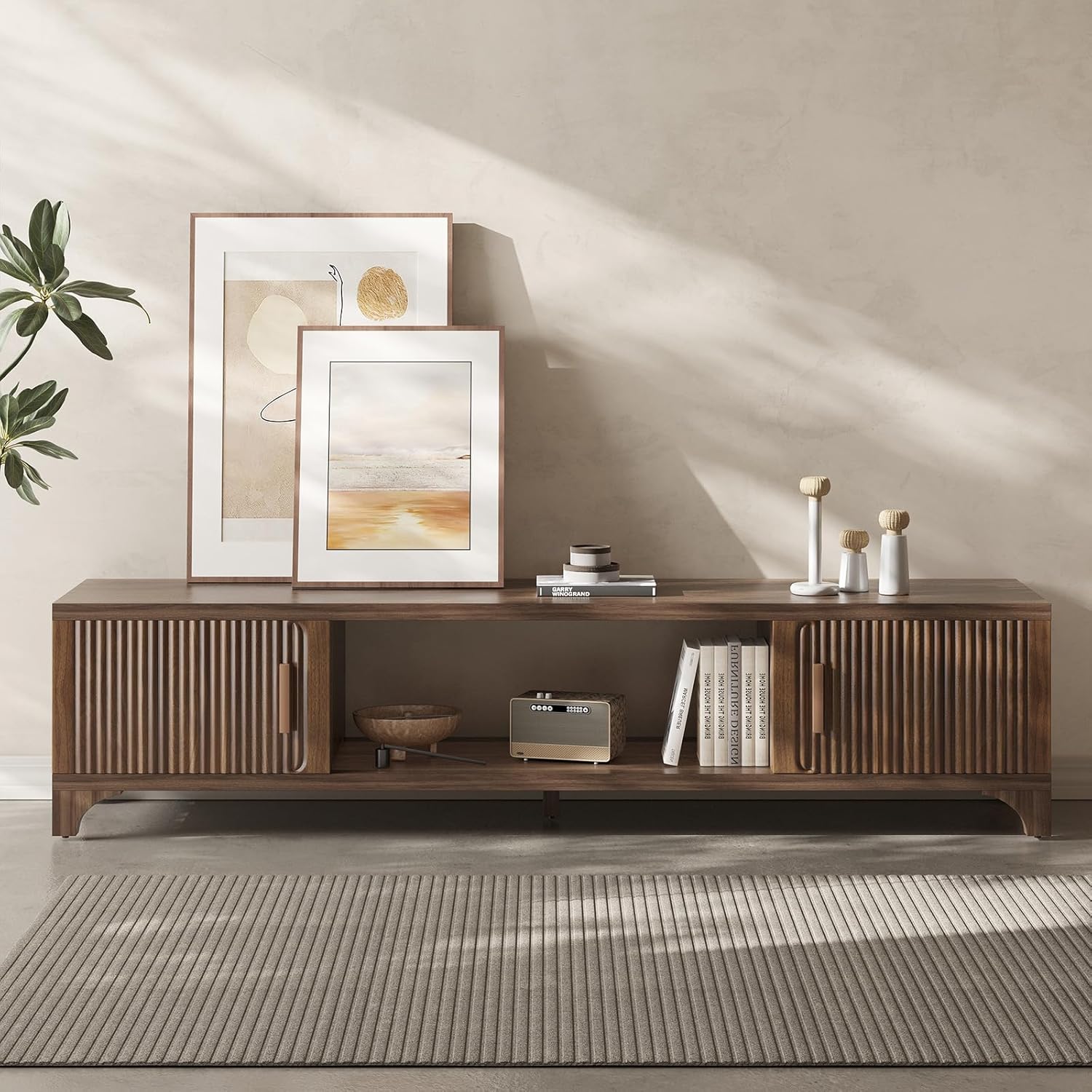 Mid Century Modern TV Stand for 70/75 Inches Television, TV Console with Fluted Doors and Storage, Entertainment Center for Living Room and Bedroom, Dark Brown